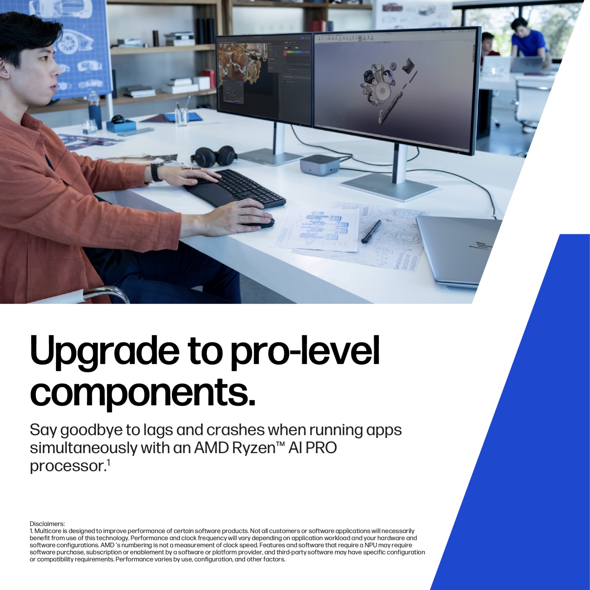 Say goodbye to lags and crashes with fast responsiveness on projects. With up to an AMD Ryzen™ 5 PRO 230 processor[2] and large memory configurations,[3] open large files and run pro apps simultaneously for speedy multitasking and increased productivity.