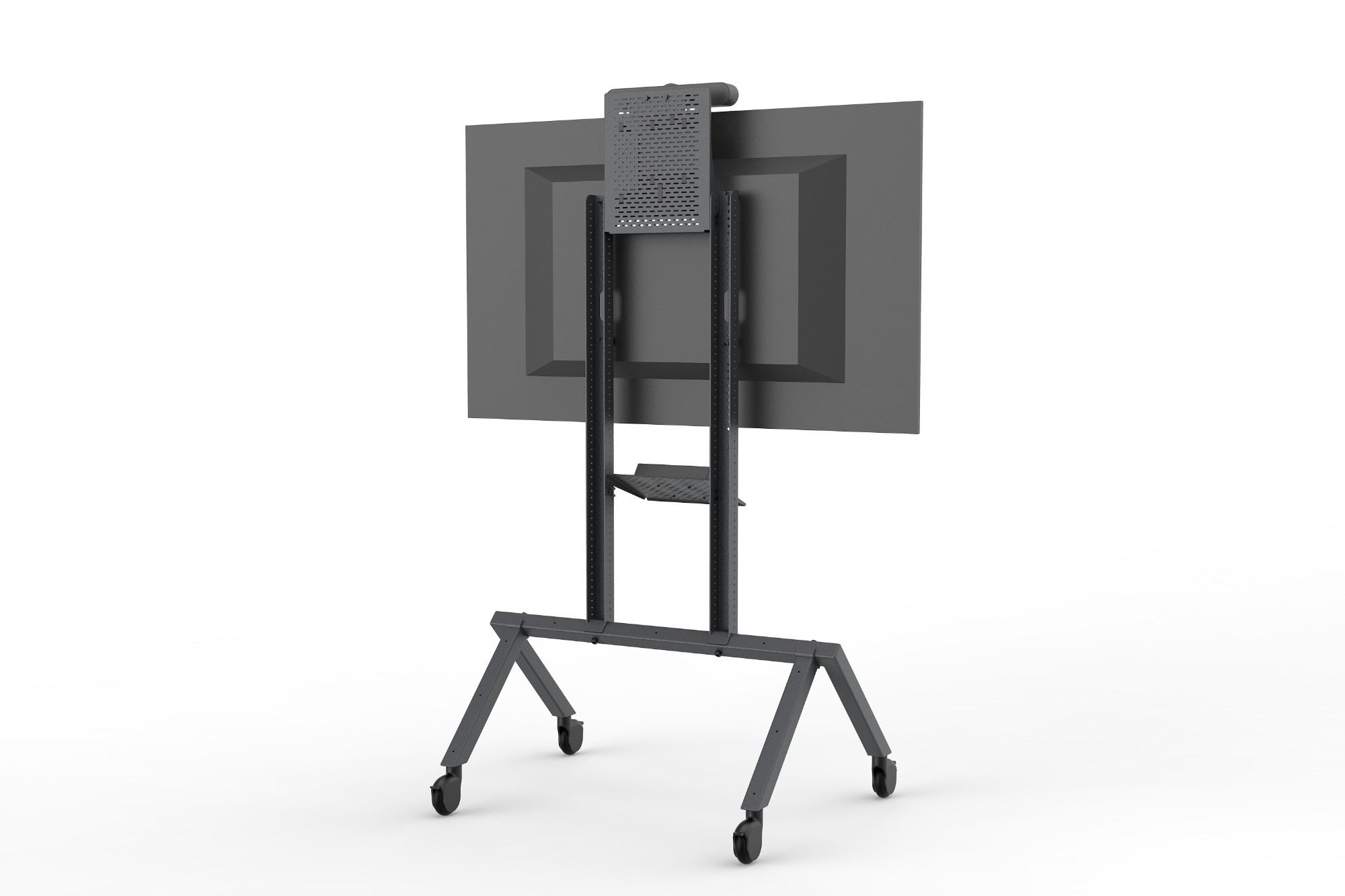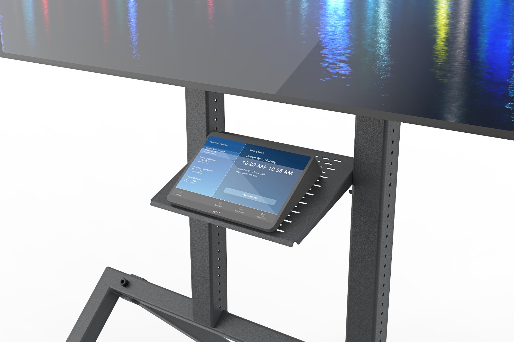Every Heckler AV Cart Prime includes Control Shelf. With this carefully designed accessory you can mount Logitech Tap, Zoom Rooms Console, Neat Pad, and any other control screen that has a VESA-compatible mounting pattern. Install Control shelf upside-down to place loose items on your cart. Install Control Shelf at various angles and heights to position your controller perfectly for standing and seated scenarios.