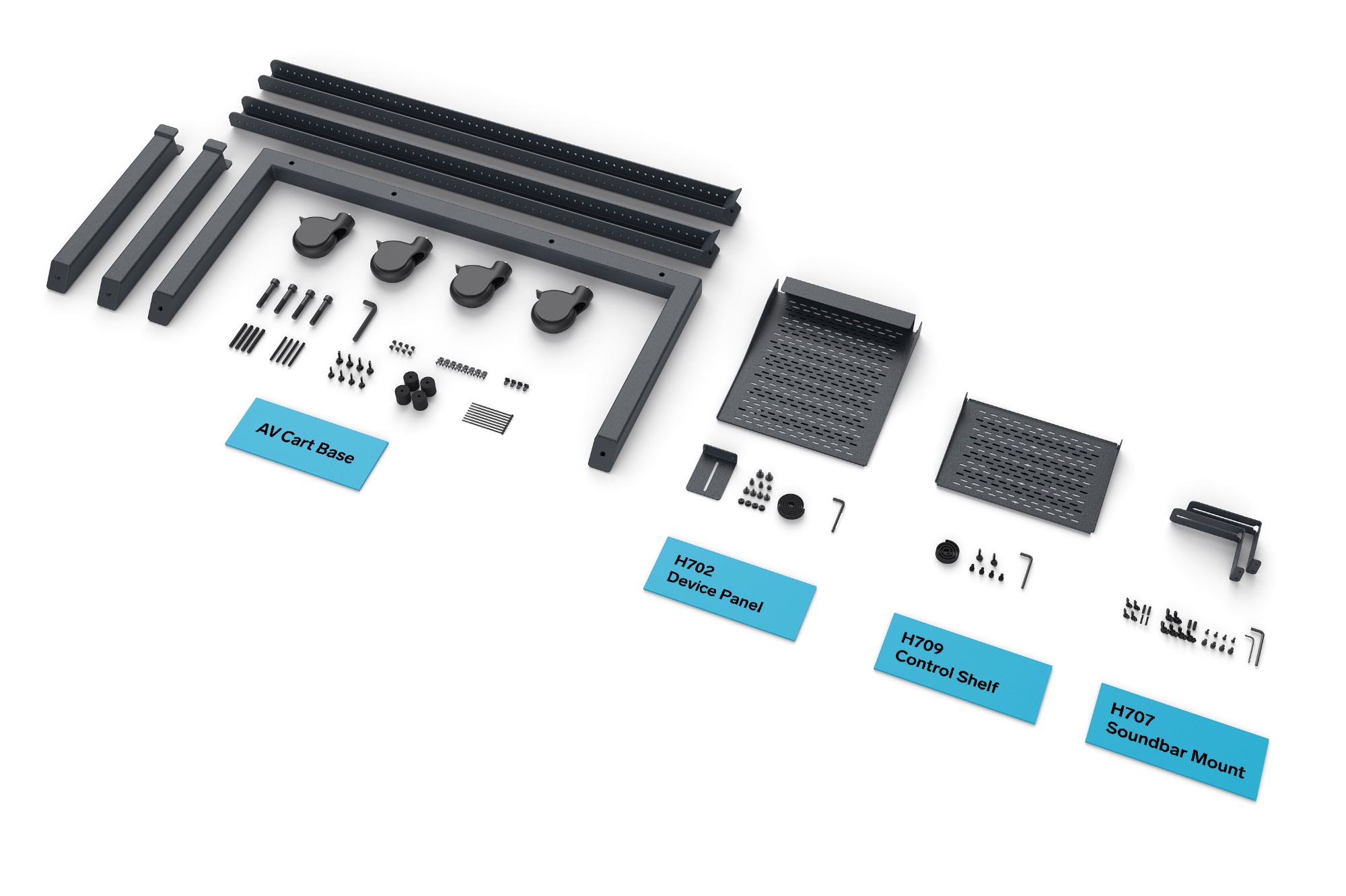 We know you have better things to do than to build carts all day, so we designed Heckler AV Cart Prime's main structure to assemble in a handful of minutes with only four socket-head bolts. All of the detailed configuration of the devices to the panels can be performed on a tabletop offsite, then quickly fastened to the main structure onsite.