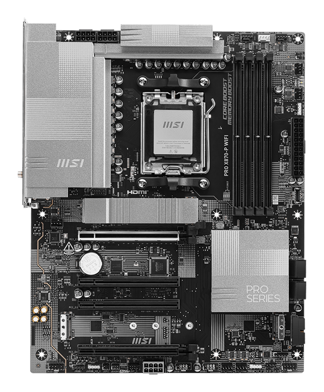 PRO X870-P WIFI offers a simple design with a harmonious silver color scheme that perfectly matches both white and black PC builds. It is engineered with many exclusive features of MSI, a true Wi-Fi 7 with EZ Antenna, 5G LAN, PCIe 5.0 M.2 with EZ M.2 Shield Frozr II, and Supplemental PCIe Power, ready for the AMD Ryzen™ 9000 series processors.