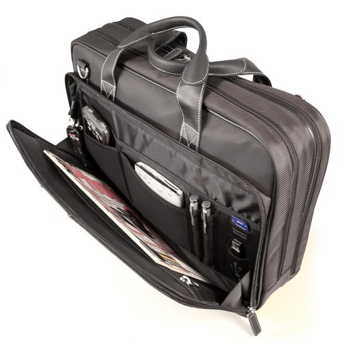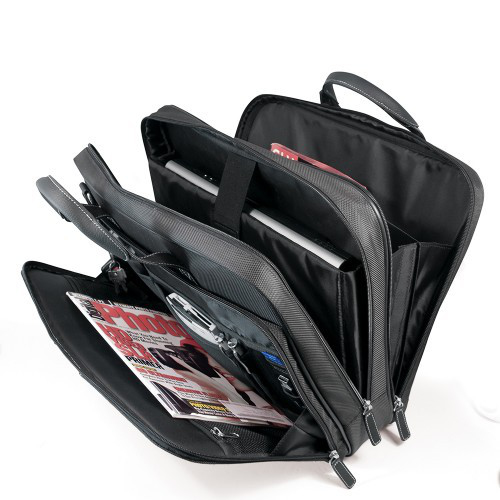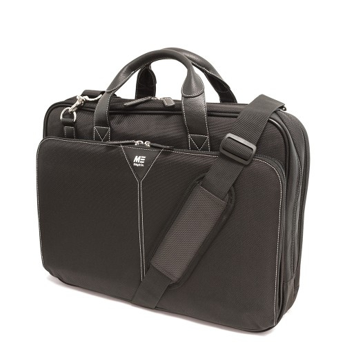 Part of the new "Metro" Collection by Mobile Edge, the Premium Nylon Briefcase is the perfect case for the professional with a sense of style. This sleek and lightweight laptop case is built with a rugged 1680D Ballistic Nylon exterior. Stylish contrast stitching and polished nickel fittings enhance the elegant design. In addition to the padded computer pocket, there are two full-size interior compartments for your work papers, legal-size file folders and travel accessories. A separate divided file section ensures you have space for all your work papers. An easy-access workstation features elastic pockets for your cell phone, iPod, media cards, flash drives, plane tickets, pens plus a full-length secure mesh pocket for travel receipts or other miscellaneous items. Other features include leather-wrapped carry handles, a removable/adjustable shoulder strap, key fob, heavy-duty steel fittings, a full-size exterior magazine pocket and a convenient trolley strap.