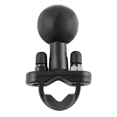 The RAM motorcycle handlebar base contains a 1.5" rubber ball designed to sit at right angles to the mounting rail. The zinc coated u-bolt accommodates rails in diameter from 0.5" to 1.25" in diameter. Included are black cover caps to be placed over the exposed ends of the u-bolt and a composite adapter that can narrow the rail to a minimum width of 0.5".