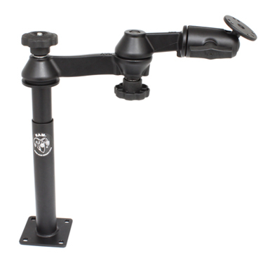 The RAM-VP-SW1-89 consists of a 9" lower female Tele-Pole, 8" upper male Tele-Pole, double swing arm and 2.5" round base that contains the universal AMPs hole pattern. The lower female Tele-Pole will attach to all RAM vehicles bases that do not contain a welded female Tele-Pole. The height of the Tele-Poles, combinded, can easily be adjusted by turning the knob at the top of the post. Once the knob has been tightened, the Tele-Pole becomes a rigid support for connecting devices or cradles. The double swing arm allows you to twist and tilt the viewing angle of your connected electronic device, when mounted on your RAM Vehicle Mount. The rotating swivel arm gives you even more viewing positions for your mounted electronic device while holding everything firmly in place. The length of the double swing arm is 12".