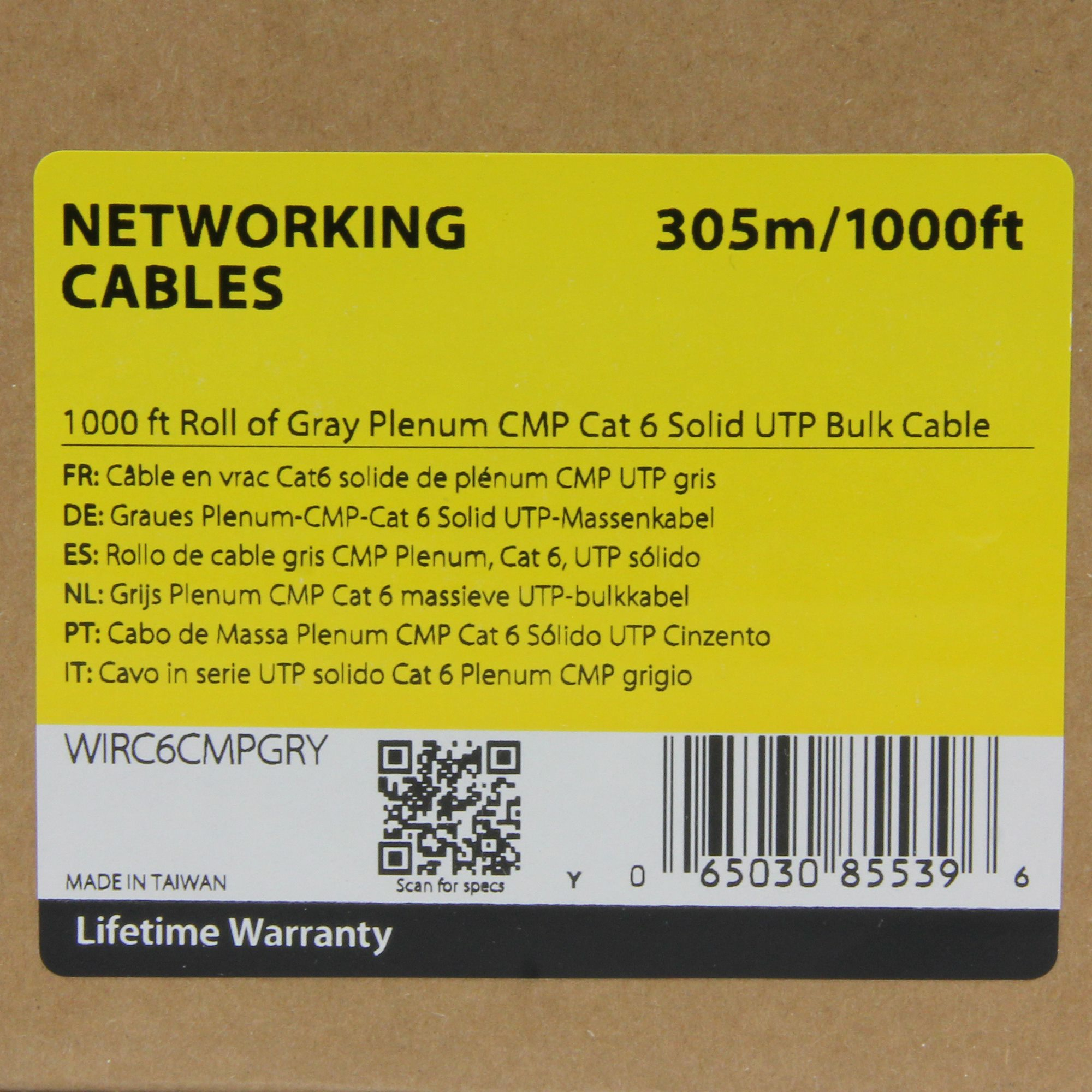 The WIRC6CMPGRY Cat6 Plenum Bulk Cable (1000 ft) meets or exceeds all Category 6 cable specifications to ensure reliable Gigabit network connections, and features a foot-marked jacket that enables you to measure your cable runs to your exact installation requirements. Also, the gray PVC jacket enables you to color code your drops as needed for a more organized installation.