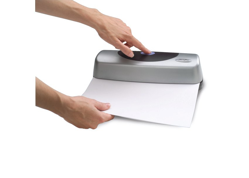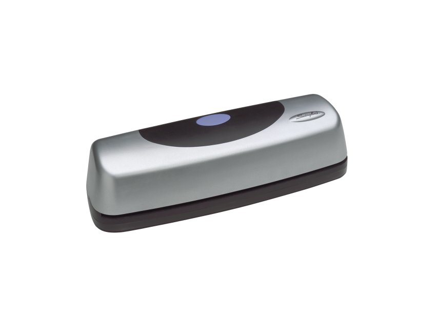 Sleek, personal 3-hole punch is ideal for travel and features seamless automatic operation. Punch with just the touch of a button.