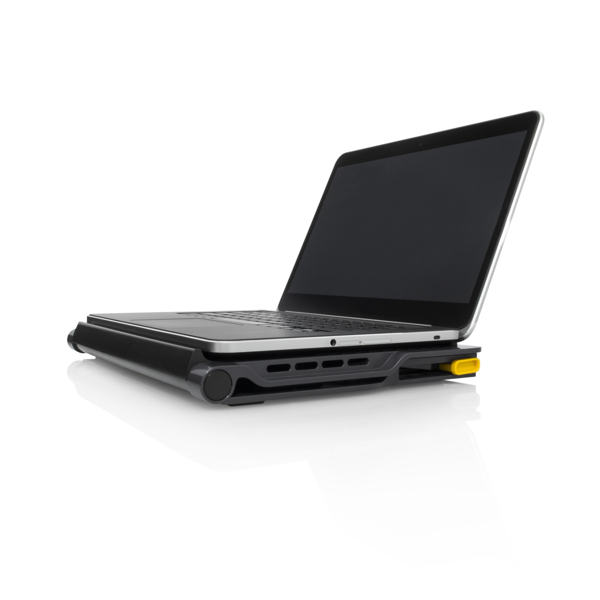 Dual fans to help keep you and your laptop cool; 4-port Hub for connection to peripherals; Adjustable height (4 levels) lets you use as a laptop stand with external keyboard; Bottom ledge keeps laptop in place; Velcro straps keep peripheral cables neat