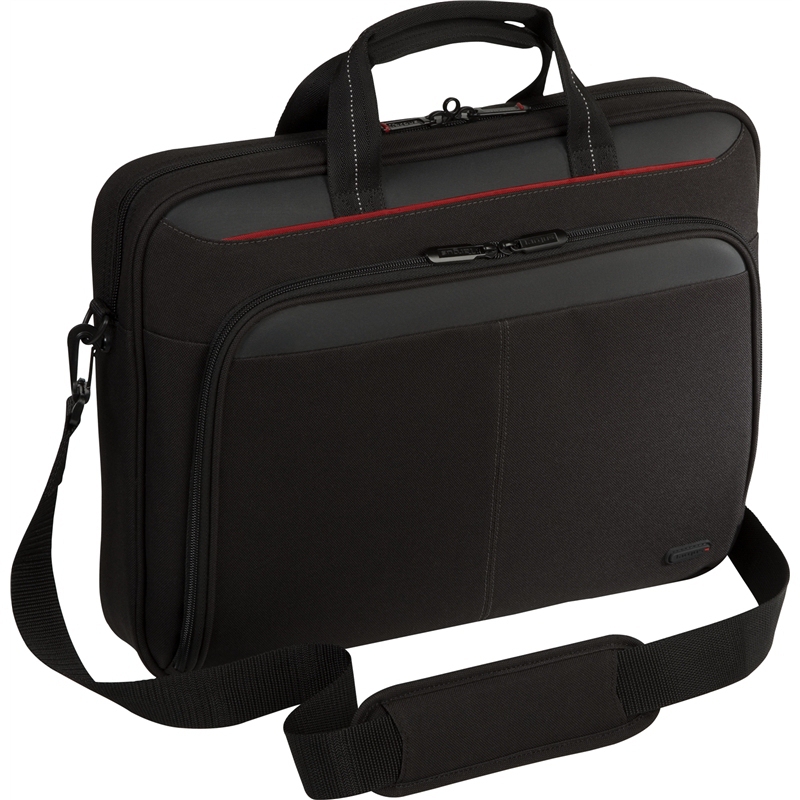 The Targus 16” Classic Topload is a thin, lightweight case equipped to store all of your essentials on-the-go. The padded laptop compartment is designed to accommodate laptops with up to 16” screens. Ideal for the casual business executive, this lightweight and functional case features a classic look with red accents. The spacious front pocket includes smartly-organized compartments to store your mobile phone, pens, business cards, adapters, cords and other midsized accessory items. The large back slip pocket is good for storing files and documents while the included trolley strap makes it easy to stack this case onto rolling luggage. Constructed of durable polyester material, the case includes metal, contoured zipper pulls and comfortable, padded handles and shoulder strap. This case also includes a convenient trolley strap to stack case on rolling luggage for easy travel.