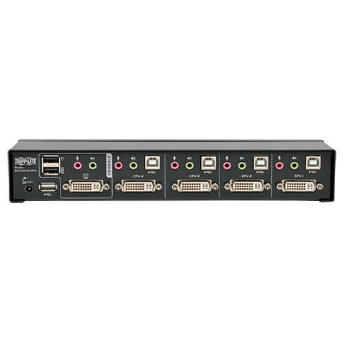 The B004-DUA4-HR-K is a 4-Port DVI/USB KVM Switch with audio and USB 2.0 peripheral sharing. It allows you to access, control, boot and reboot four computers from a single USB keyboard, USB mouse, and monitor. Switching between connected computers is quick and simple using keyboard hotkeys or pushbuttons. An independent audio/mic and USB peripheral switching function allows for an uninterrupted experience. A computer can be printing on a printer connected to one of the USB 2.0 peripheral ports, while you listen to audio from and access another computer; all at the same time. The B004-DUA2-HR-K uses DVI-I technology, allowing for the transmission of a digital (up to 1920 x 1200) or analog (up to 2048 x 1536) signal. A DVI to VGA adapter, such as Tripp Lite's P126-000, is required for conversion to an analog monitor. Whichever you use, full time DDC support provides the necessary EDID information required for optimal video performance on Windows 7 and other operating systems. Compatible with all major operating systems.