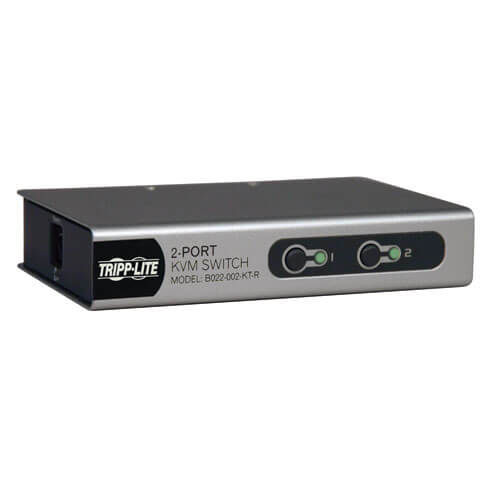 Tripp Lite's B022-002-KT-R 2-port KVM Switch is the optimal solution for controlling 2 computers from one keyboard, mouse and monitor. Installation is a snap - just connect the PCs using the included PS/2 cable kits. P776-Series USB KVM cable kits are available separately for connection of USB computers. Easily switch between computers via front-panel push buttons or keyboard hotkey commands.