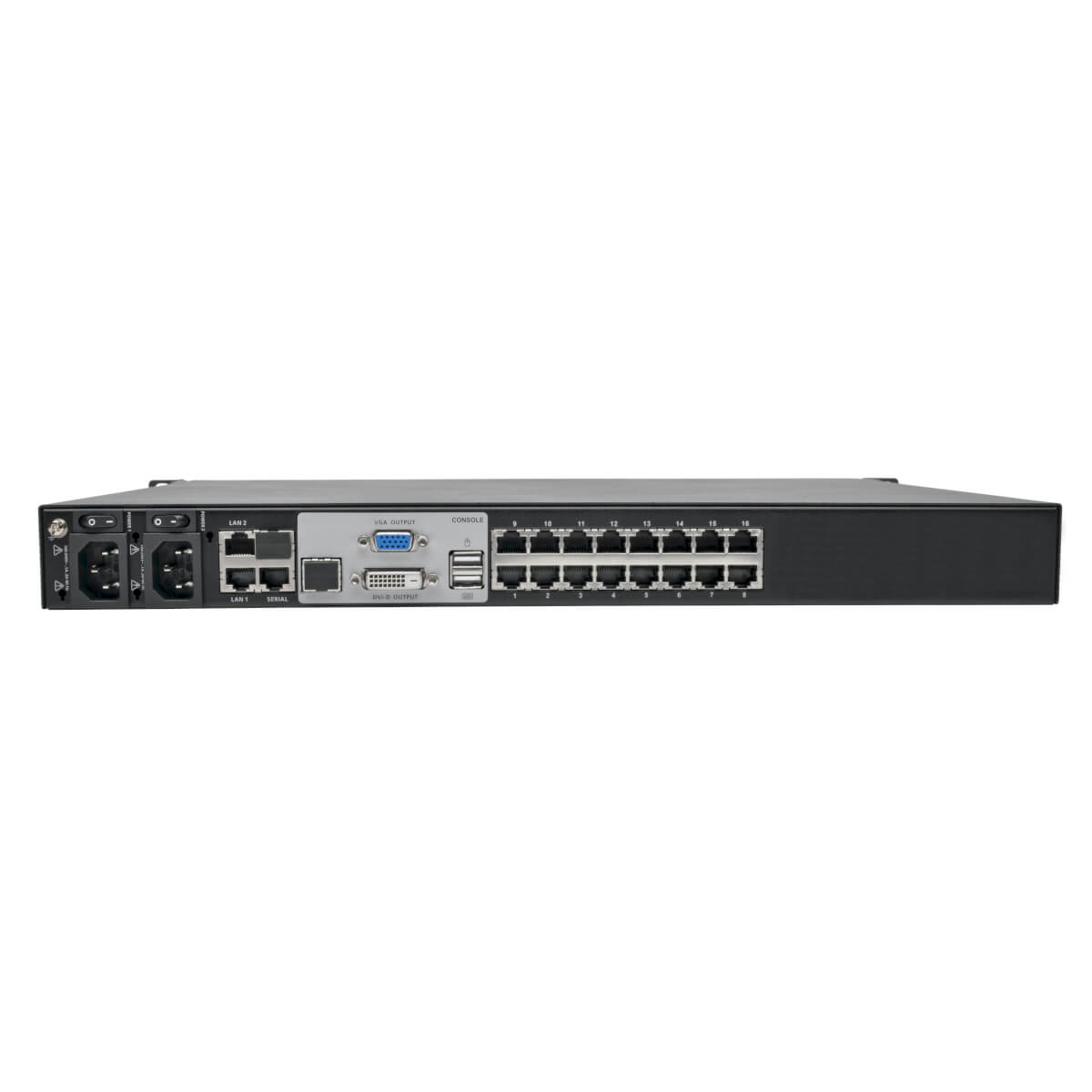DVI and VGA console ports are included, though only one monitor may be connected at a time. The local console supports resolutions up to 1600 x 1200 @60 Hz with 32-bit color depth while the remote session (up to 164 feet) supports high-definition video resolutions up to 1600 x 1200 at 60 Hz with 24-bit color depth.