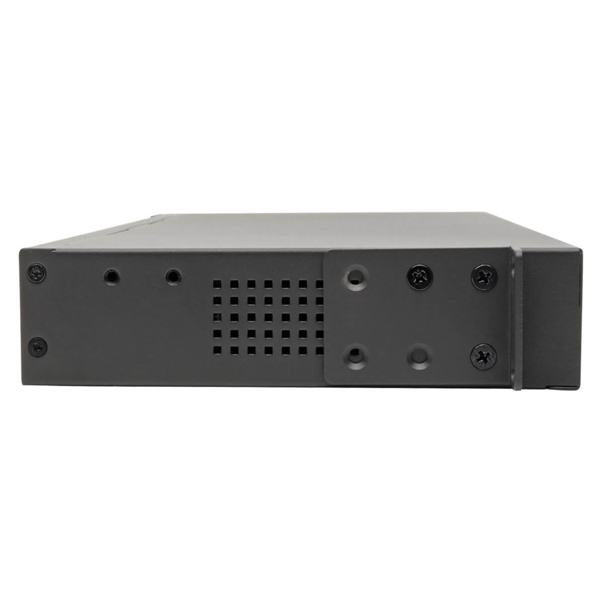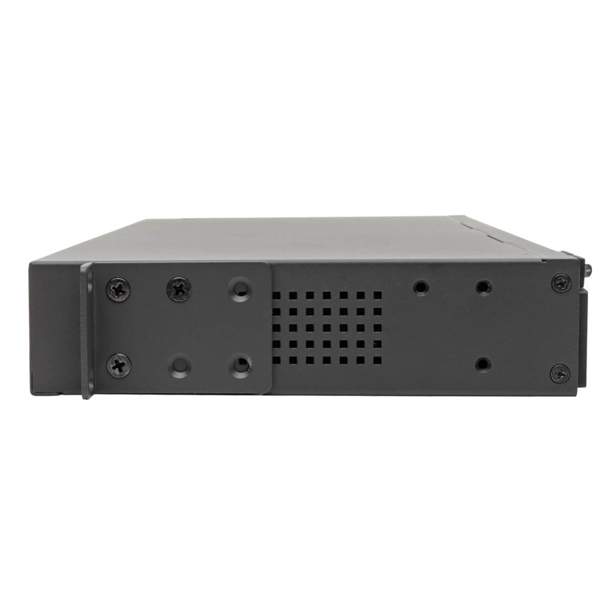 The heavy-duty steel housing comes with mounting brackets for 1U installation in an EIA-standard 19-inch rack. Its fanless form factor also allows desktop deployment on included rubber feet that help prevent the unit from sliding. User-supplied power cords connect the console server to a compatible power source.