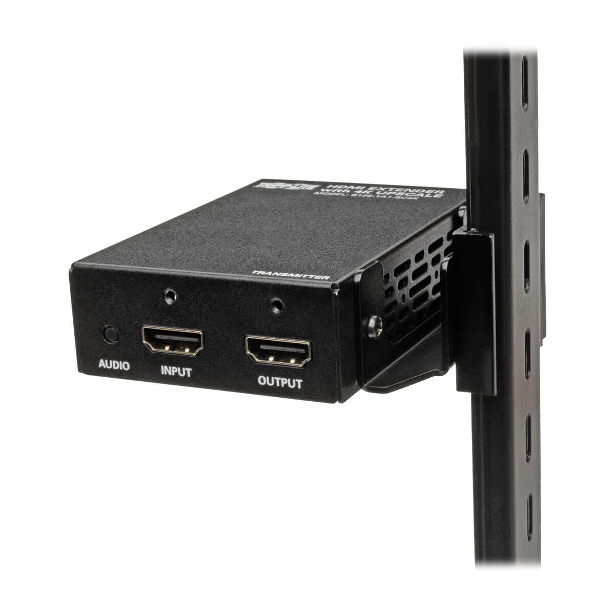 This DIN rail-mounting bracket attaches to units with mounting holes spaced 65 millimeters apart. Select equipment includes the B126-Series, B130-Series, B132-Series and BHDBT-Series of transmitters, receivers and extenders.