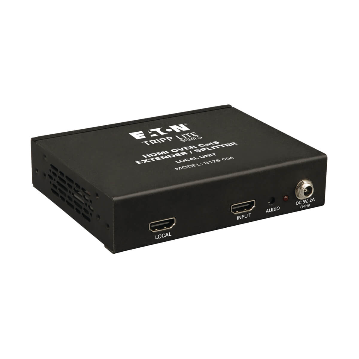 The B126-004 4-Port HDMI over Cat5/Cat6 Extender/Splitter works with Tripp Lite B126-Series remote receivers to split a single HDMI audio/video signal into five separate signals—one local and four remote. It’s ideal for digital signs, trade shows, presentations, retail settings and other applications where the video source is located farther than conventional cables allow or that require multiple displays connected to one source. It uses HDMI cable (see Tripp Lite’s P568-Series) to connect to the source and the local monitor and Cat5e/6 cable to transmit to the remote monitors (for best results, use 24 AWG solid-wire Cat5e/6 cable, such as Tripp Lite’s N202-Series).