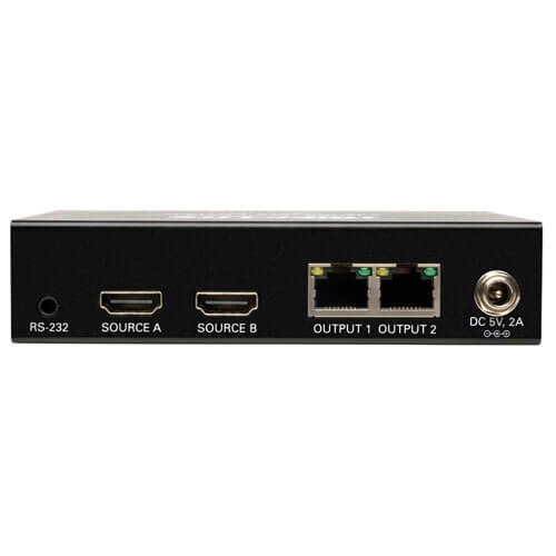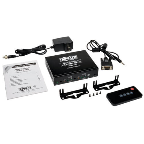 The B126-2X2 2-port HDMI over Cat5/Cat6 Matrix Splitter Switch works with Tripp Lite remote receivers to share one or more HDMI sources between multiple projectors, monitors or televisions. It’s ideal for digital signs, trade shows, presentations, retail and other applications where the video sources are located farther than conventional cables allow or that require multiple displays connected to one source. It uses HDMI cable (see Tripp Lite’s P568-Series) to connect to the sources and Cat5e/6 cable to transmit to the remote monitors (for best results, use 24 AWG solid-wire Cat5e/6 cable, such as Tripp Lite’s N202-Series). Any video source can be routed to any monitor, or you can send the same source to multiple monitors. Switch between inputs via pushbuttons, RS-232 serial or the included remote control. When used with Tripp Lite’s B126-1A0 or B126-1A0-WP-1 active remote receivers, the switch can extend a 1080i (60 Hz) signal up to 53.34 m (175-ft.) or a 1080p signal (60 Hz) up to 38.1 m (125-ft.). With a B126-1P0 or B126-1P0-WP-1 passive remote receiver, it can extend a 1080i (60 Hz) signal up to 22.86 m (75-ft.) and a 1080p (60 Hz) signal up to 15.24 m (50-ft.) Add up to three B126-110 remote repeaters to each channel to fully extend the signal range or add more displays. In addition to crystal-clear video, the B126-2X2 delivers full, rich stereo. Easy to set up with no software or drivers to install. Mounts to a wall, rack or pole using the included hardware.