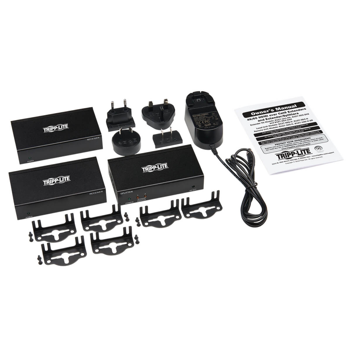 The included transmitter/splitter and receiver units work right out of the box with no software required. Mounting hardware is included for installing the units on walls, poles or 19-inch racks. Connect the transmitter to the source and the receivers to the displays with user-supplied HDMI cables (such as Tripp Lite's P568- or P569-Series). Then, connect the transmitter to the receivers using Cat6 patch cable (such as Tripp Lite N202-Series cable).