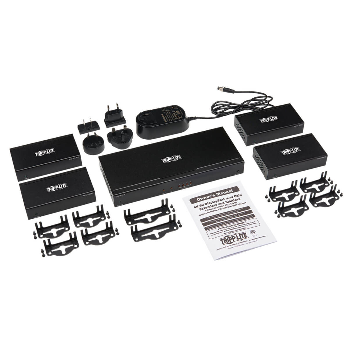 The included transmitter and receiver units work right out of the box with no software required. Mounting hardware is included for installing the units on walls, poles or 19-inch racks. Connect the transmitter to the source with a DisplayPort cable (Tripp Lite P580-Series) and the receivers to their displays with HDMI cable (such as Tripp Lite's P568- or P569-Series). Connect the transmitter to the four receivers using Cat6 patch cable (Tripp Lite N202-Series). You can also connect an optional display to the transmitter's local HDMI output to monitor the image transmitted to the receivers up to 125 feet away.