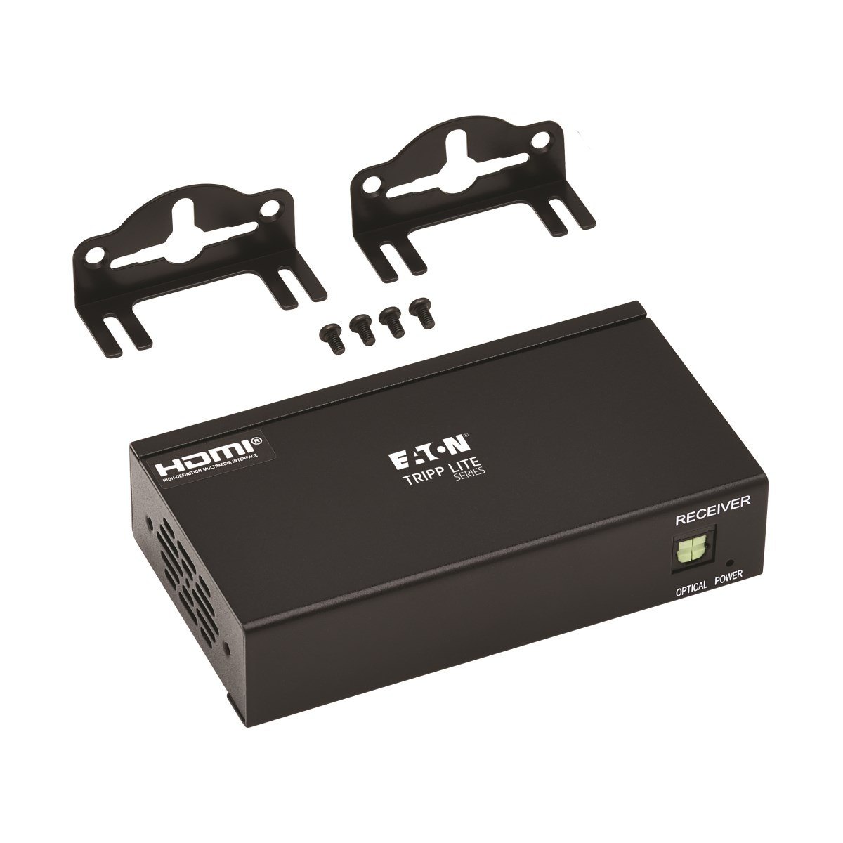 The receiver works right out of the package with no software required. Mounting hardware is included for installing it on a wall, pole or 19-inch rack. Connect the receiver to a transmitter, switch or splitter with user-supplied Cat6 cable (such as N202-Series). Connect to two 4K displays with user-supplied HDMI cables (such as P568- or P569-Series).
