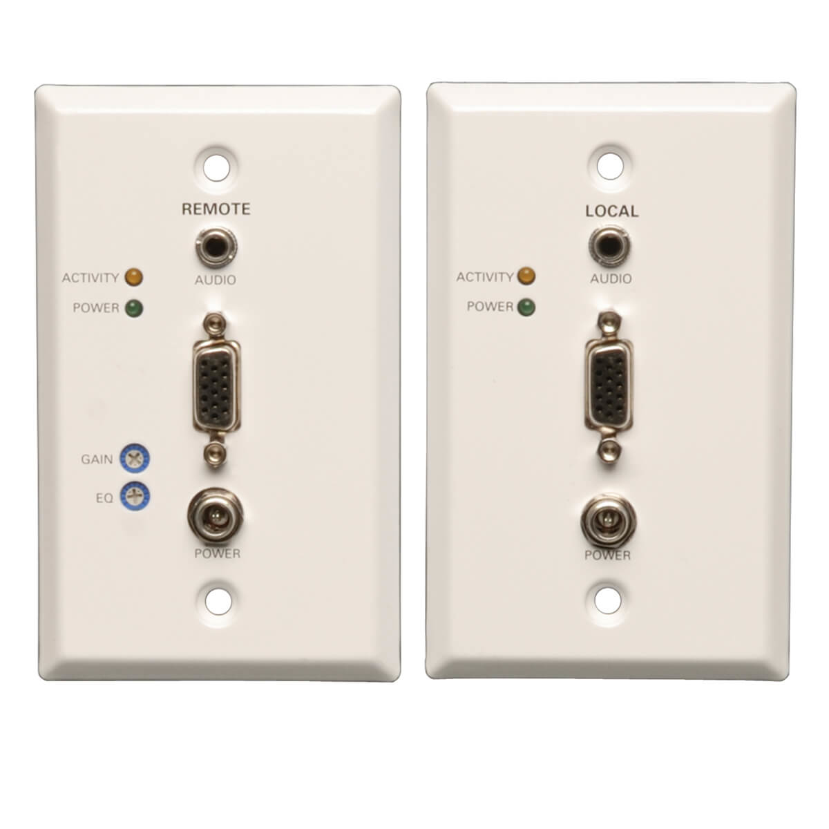 Wallplate transmitter and receiver work in tandem to extend a VGA signal via Cat5e/6 cable to a projector, monitor or television. Ideal for digital signs in schools, churches and retail applications.
