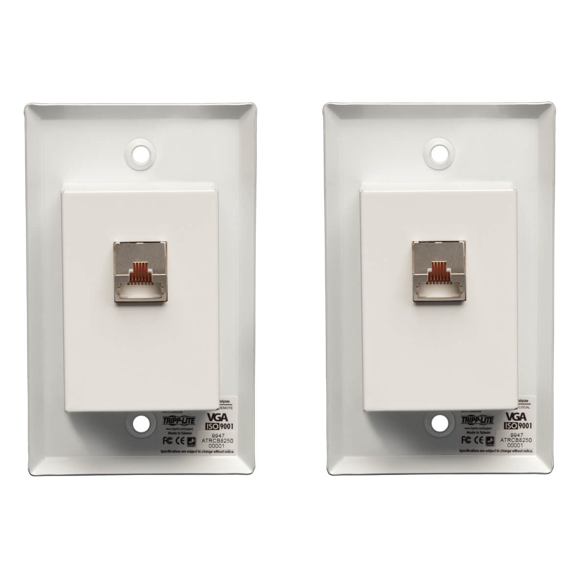The B130-101A-WP-2 can extend a 1024 x 768(60 Hz) signal up to 1,000 feet and a 1920 x 1440(60 Hz) signal up to 500 feet when using 24 AWG solid-wire Cat5e/6 cable, such as Tripp Lite’s N022-01K-GY(Cat5) and N222-01K-GY(Cat6), to connect the two units. For optimal image quality between 500 and 1,000 feet, use zero-skew cable, such as Tripp Lite’s P524-01K. The RJ45-type wallplate jacks accept standard Cat5e/6 patch cables, so no 110 punchdown connection is required.