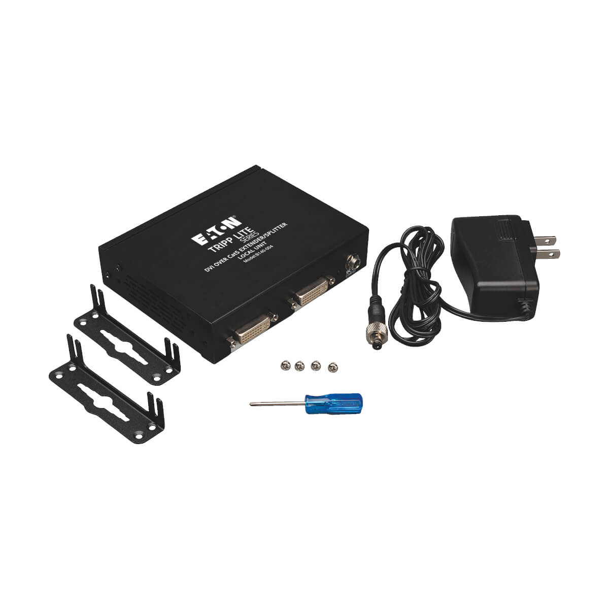 The B140-004 transmits a DVI-D Single-Link signal to four monitors up to 61 m (200-ft.) away using a single Cat5e/6 patch cable. To achieve maximum distance and resolution, use 24AWG Solid Wire Cat5e/6 cable (Tripp Lite's N202-Series). An additional DVI port is provided for the connection of a local monitor. This local DVI port can also be used to daisychain up to 3 units together, allowing for the connection of up to 13 monitors (12 remote, 1 local). Mounting hardware is included that allows the unit to be rackmounted, wallmounted or pole mounted. In addition, up to three units can be mounted in 1U of rack space using a Tripp Lite B132-004-RB 19" rackmount bracket. The B140-004 is compatible with all operating systems, and is plug and play, with no software or drivers required.