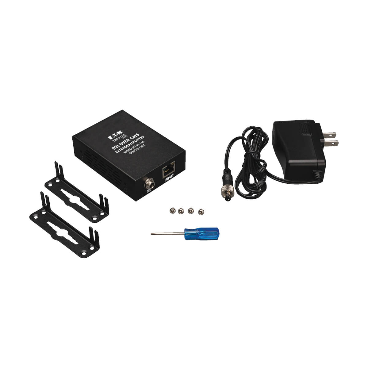 Installation is simple. Connect a B140-002 or B140-004 transmitter (not included) to a DVI source using a Tripp Lite P561-Series DVI cable (not included). Connect the B140-1A0 to a display using a Tripp Lite P561-Series DVI cable (not included). Finally, the receiver unit is connected to an RJ45 port on the transmitter unit using a single Cat5e/6 cable. A 1920 x 1080 @ 60Hz signal can be extended up to 46 m (150-ft.) from the source, or a 1024 x 768 @ 60Hz signal up to 61 m (200-ft.)