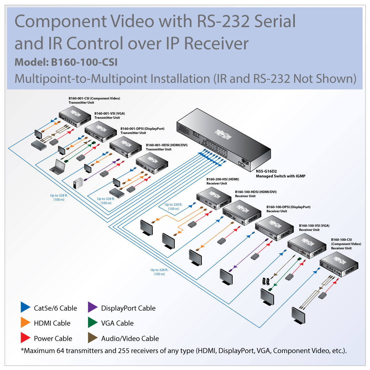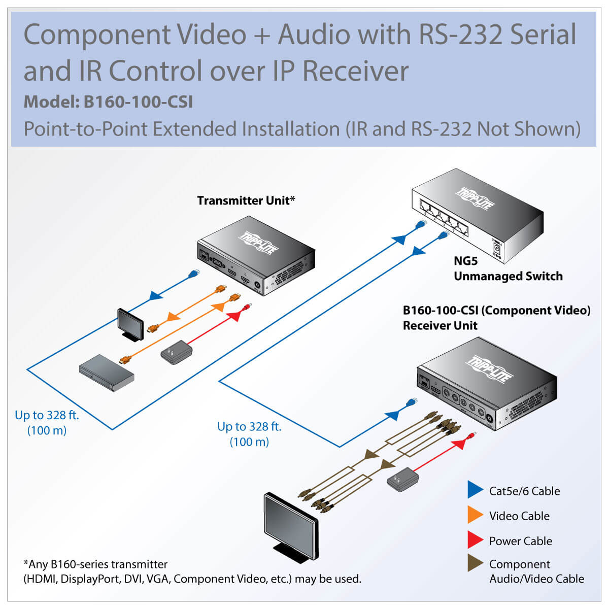 The B160-100-CSI RGB Component Video + Audio over IP Extender Receiver works with a B160-Series transmitter (sold separately) to extend and distribute component video + stereo audio, RS-232 serial and IR (infrared) remote signals from the source to the display located up to 328 feet (100 meters) away, which is more than 200 feet (61 meters) farther than a traditional Cat5e/6 solution. By adding a chain of low-cost unmanaged network switches, such as the NG5 (sold separately), you can continue extending the distance between source and display up to 328 feet per switch.