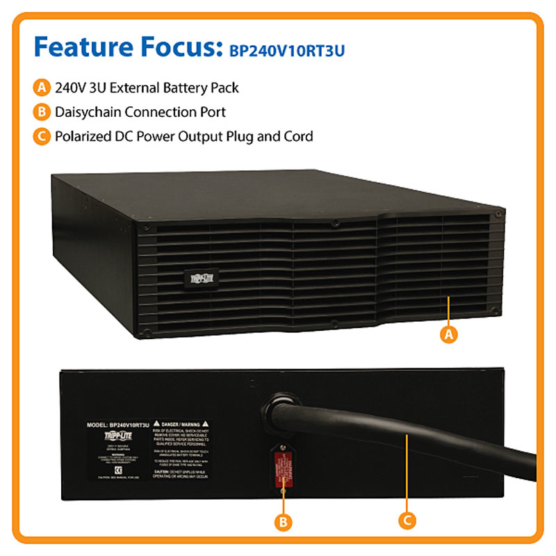 BP240V10RT3U rack/tower external battery pack offers extended battery runtime when used in conjunction with expandable 240V rack-mount and tower UPS systems. Includes heavy-gauge cabling with high-current DC connector for safe, simple installation. Included daisy-chain connector enables the connection of additional compatible 240V external battery packs to the host UPS. Included mounting accessories support 3U rack-mount installation in 4-post racks. Options for 2-post center-mounting and upright tower installation available.