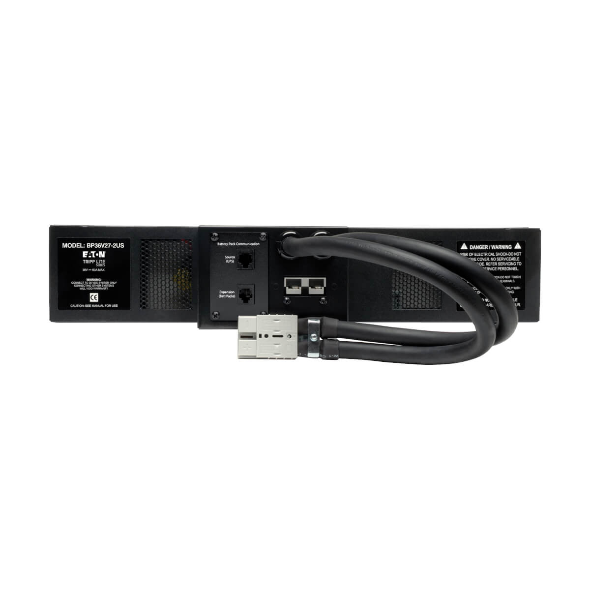 The BP36V27-2US is compatible only with select 36V DC UPS systems that specify the use of this battery pack. Not only does it provide extended runtime, but it can also be daisy-chained using its rear connector to additional external battery packs for even longer extended-run operation. Heavy-gauge cabling with high-current two-point DC connector is included for simple installation. Optional-use rear-panel battery detection jacks automatically configure host UPS systems supporting this feature for one or more external battery packs.