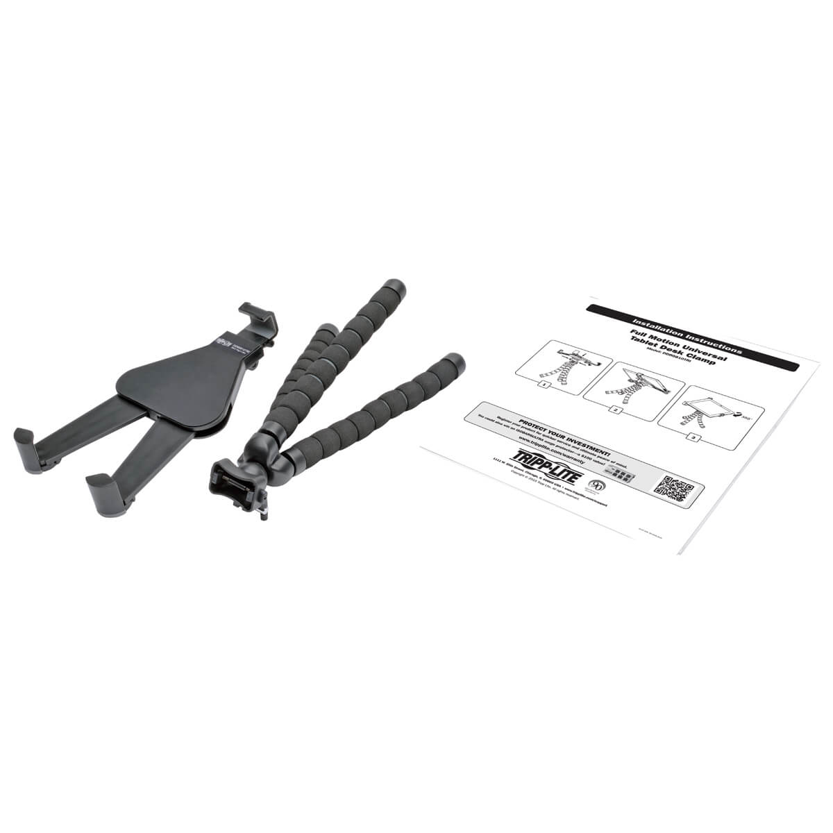 The DDR0810TRI Full-Motion Universal Flexible Tablet Stand rests securely on your desk, table, workstation or almost any other surface to maximize space and offer hands-free stability. It fits most tablets from 8 to 10 inches. Its flexible eight-inch legs bend to steady your tablet on uneven surfaces and can even wrap around objects for maximum effect. Rubber feet provide a strong grip on most surfaces. Tripod design rotates 360°, so you can view your tablet in portrait or landscape orientation. Easy assembly in seconds with no tools necessary. Supports up to 2.2 lbs (1 kg).