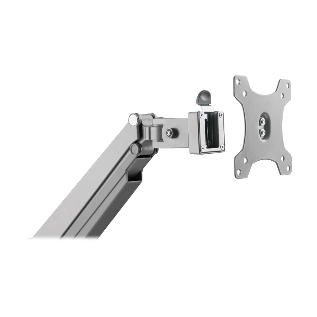 This VESA-compliant desktop clamp mounts a flat- or curved-screen display above your desk, table or workstation, allowing you to free up valuable surface space. Recommended for home or office use, the DDR1732SAL fits most flat- and curved-panel monitors from 13 to 34 inches. The durable aluminum frame tolerates frequent adjustments, and the swiveling aluminum arm supports up to 19.8 pounds (9 kg). Instead of clamping the unit to your desktop, you may install it using the included grommet. All hardware is included. Cable management brackets along the arms prevent excess cord clutter.