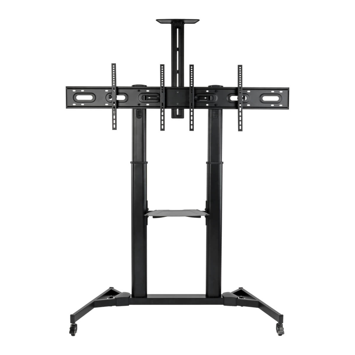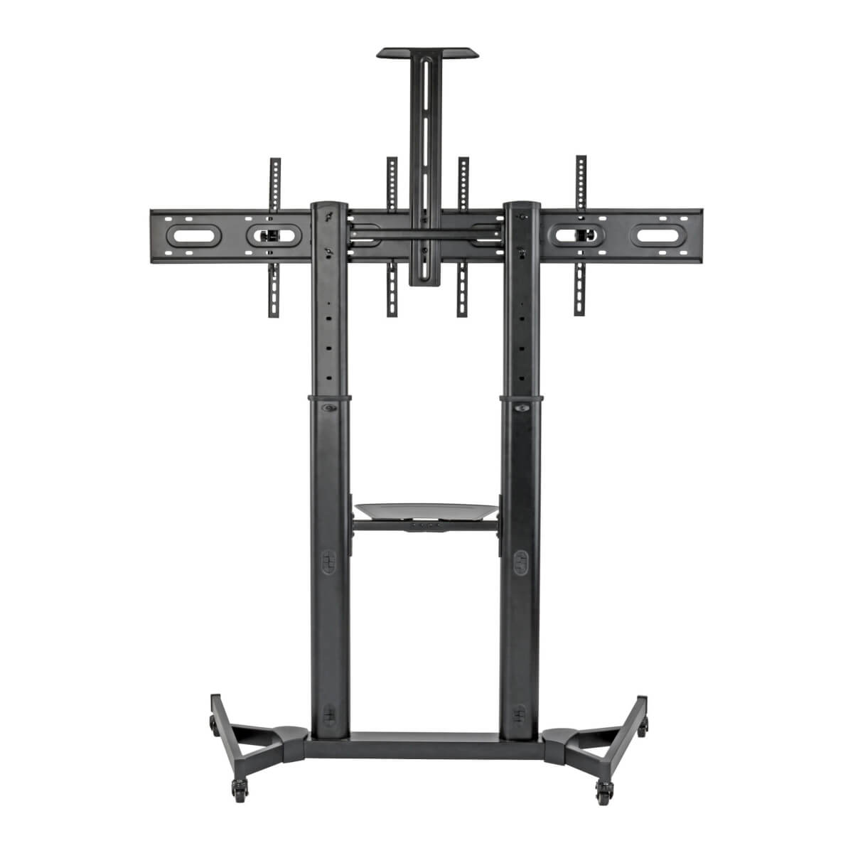 The columns telescope, so you can adjust the viewing height of the displays from 50 to 62.5 inches above the floor. For hassle-free display compatibility, this rolling TV cart supports the following VESA mounting hole patterns: 200 x 200, 200 x 300, 200 x 400, 300 x 200, 300 x 300, 300 x 400, 400 x 200, 400 x 300 and 400 x 400. The display angle can be adjusted from +10° to -10° for optimal viewing.