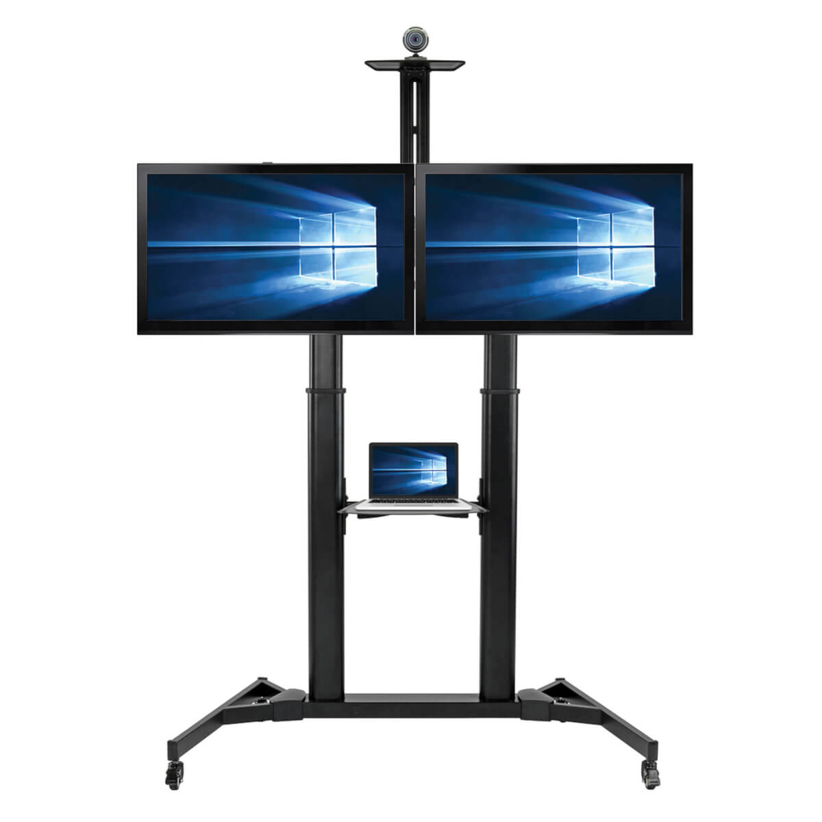 This cart has two height-adjustable shelves that each support 11 lbs (4.9 kgs). The upper shelf holds a webcam or small projector. The lower shelf holds a laptop or other video source, such as a Blu-ray player. Add a clamp-on surge protector (sold separately) to the lower shelf to protect devices from power surges and help prevent line noise interference. Cable management openings in the columns allow you to route power and audio/video cords, reducing clutter for a clean, professional look.