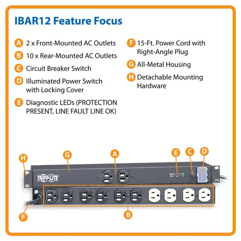 Tripp Lite's IBAR12 offers network-grade surge and noise suppression in a versatile all-metal multi-mount cabinet. Detachable mounting flanges are configurable for rack mount, wall mount and under-counter installation. Uses only 1 rack space (1U) when installed in any 19 inch EIA standard rack. Features network grade AC surge suppression with EMI/RFI noise filtering. Outlets are arranged in exclusive isolated filter banks to limit noise interaction among connected items. Includes 12 outlets (2 front/10 rear), 15 ft AC power cord and guarded power switch to reduce the risk of accidental shutoff. $25,000 Ultimate Lifetime Insurance (U.S., Canada, and Puerto Rico only) coverage.