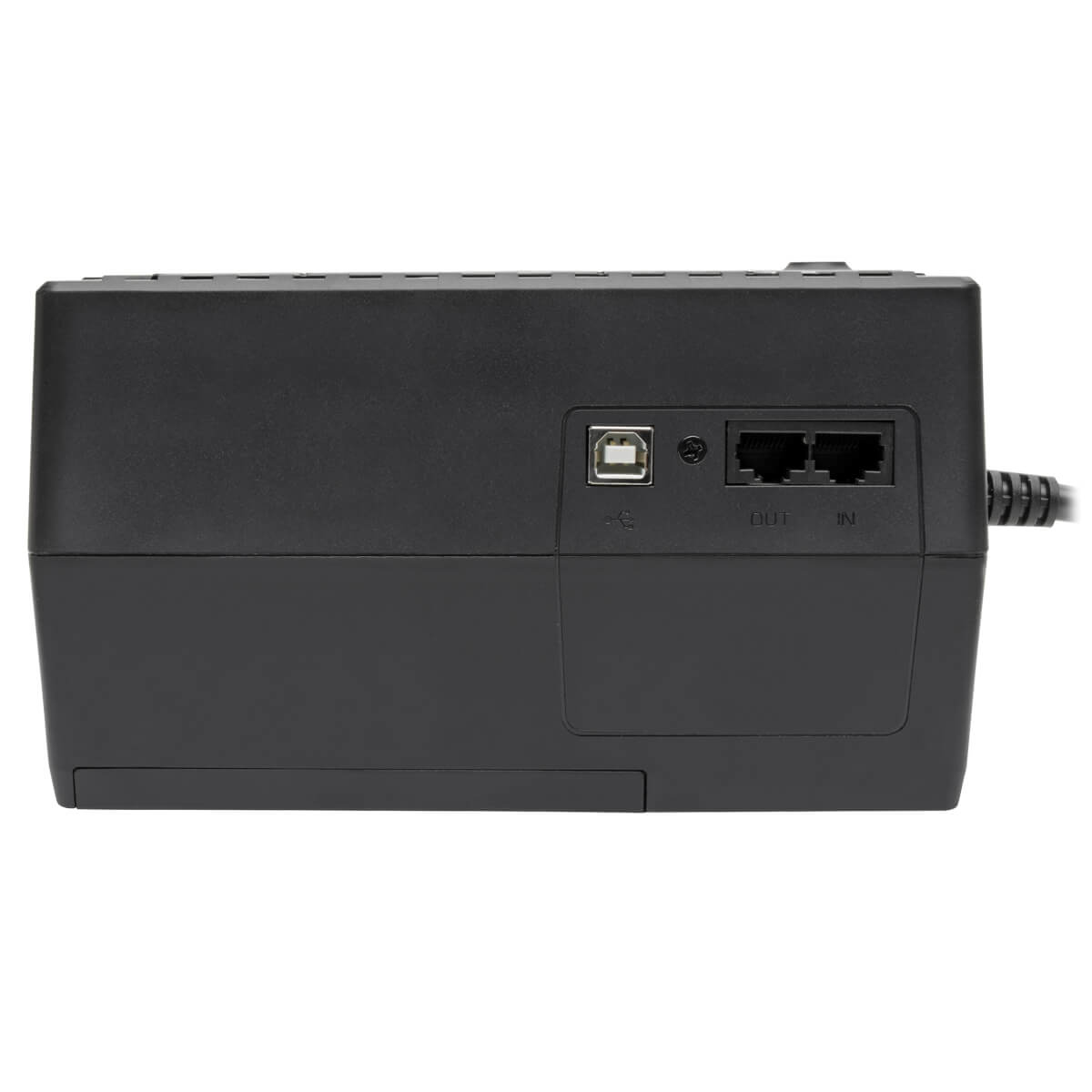 Tripp Lite INTERNET600U. UPS topology: Standby (Offline), Output power capacity: 0.6 kVA, Output power: 300 W. AC outlet types: NEMA 5–15R, Power plug: NEMA 5-15P, AC outlets quantity: 10 AC outlet(s). Typical backup time at half load: 9.9 min. Form factor: Tower, Product color: Black, Housing material: Acrylonitrile butadiene styrene (ABS). Cables included: USB cable