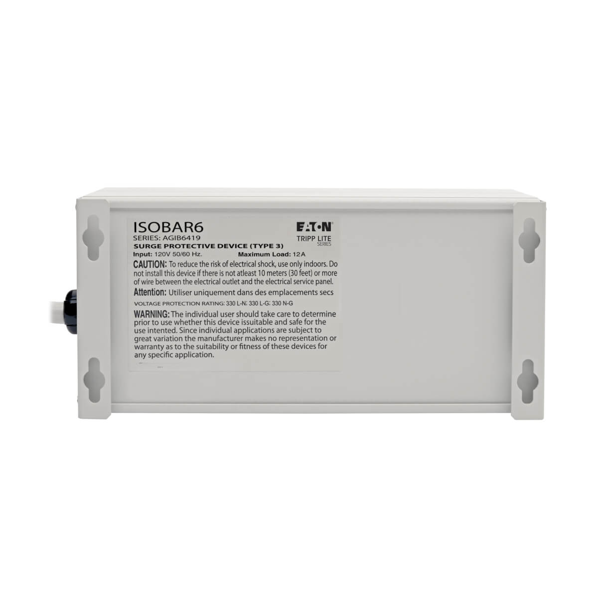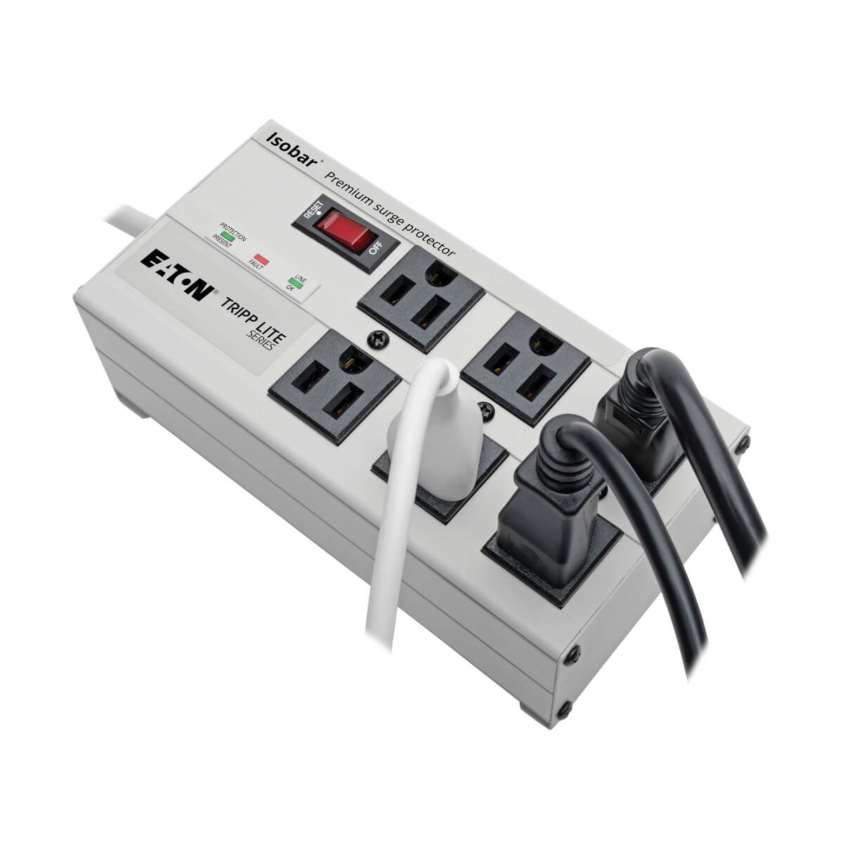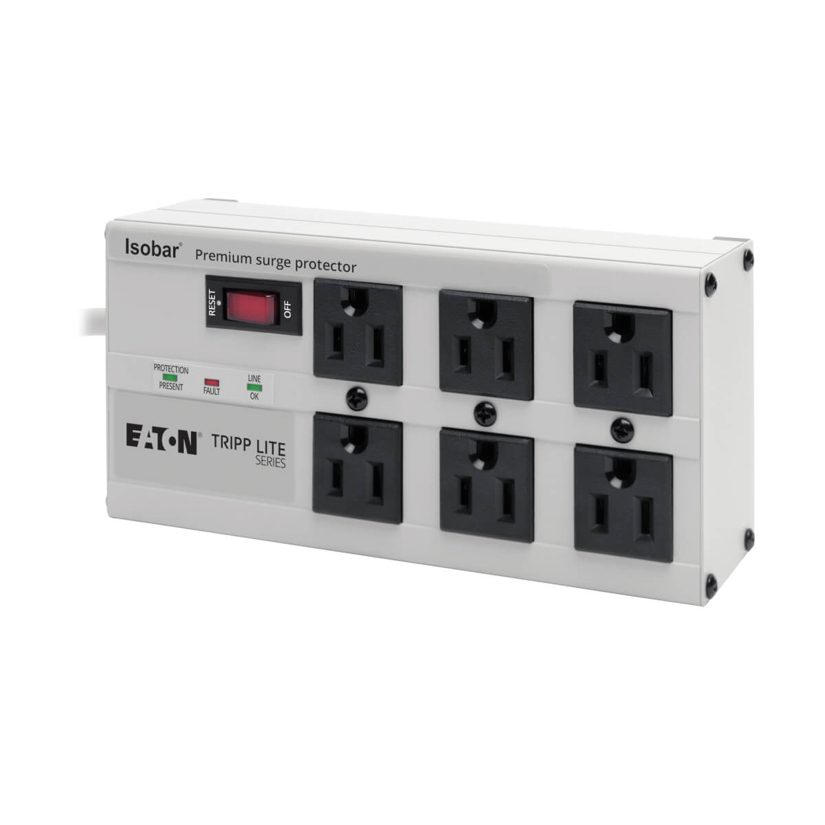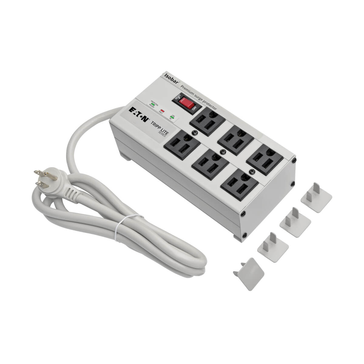 Tripp Lite ISOBAR6. Surge energy rating: 2350 J, AC outlets quantity: 6 AC outlet(s), Nominal input voltage: 120 V. Product color: Black, EMI/RFI noise filtering: 80 dB, Country of origin: China. Cable length: 70.9" (1.8 m), Weight: 2.4 lbs (1.09 kg), Width: 6" (152.4 mm). Certification: UL1449/UL1283/UL1363/cUL/IEEE 587 A&B. Package width: 3.2" (81.3 mm), Package depth: 7.2" (182.9 mm), Package height: 11.5" (292.1 mm)