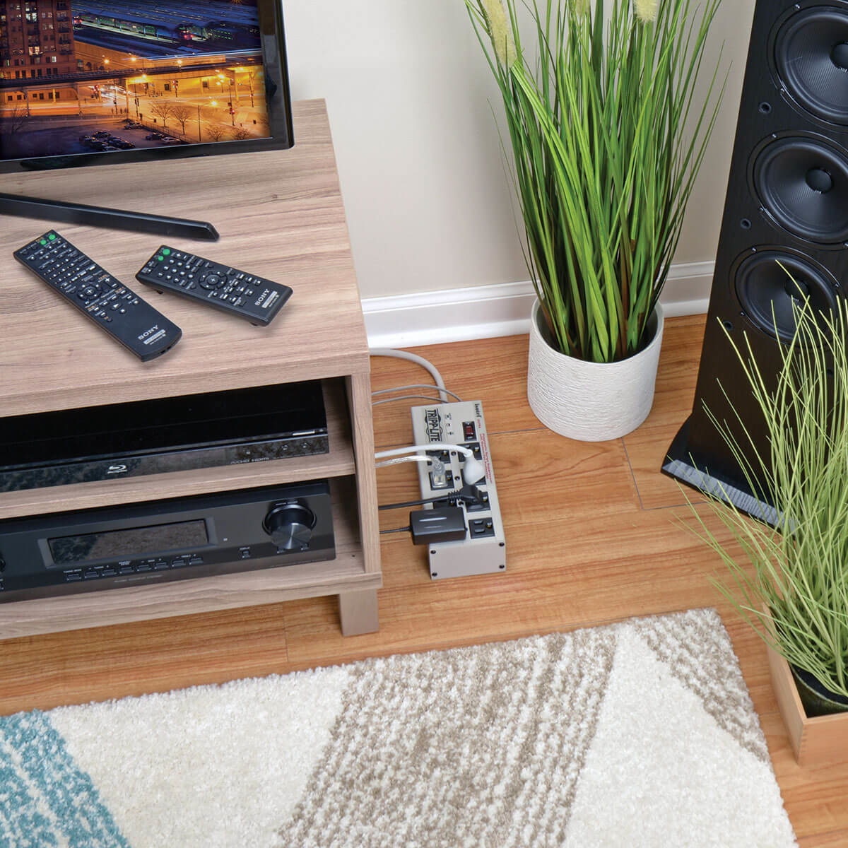Included safety covers protect against dust while blocking accidental contact with unused outlets. An integrated 12A circuit breaker protects all outlets and shuts down connected equipment in the event of an overload. A lighted on/off switch provides one-touch control over connected components. Diagnostic LEDs show power, protection and line fault status at a glance. A 12-foot (3.7-meter) power cord with right-angle 5-15P plug reaches distant outlets and allows furniture to be placed flush against the wall.