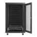 A PCI-compliant steel cabinet with EIA-standard mounting rails secures rack-mounted IT equipment. Doors and side panels lock to prevent unauthorized access, and an optional door-monitoring kit enables remote intrusion detection.