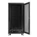 A PCI-compliant steel cabinet with EIA-standard mounting rails secures rack-mounted IT equipment. Doors and side panels lock to prevent unauthorized access, and an optional door-monitoring kit enables remote intrusion detection.