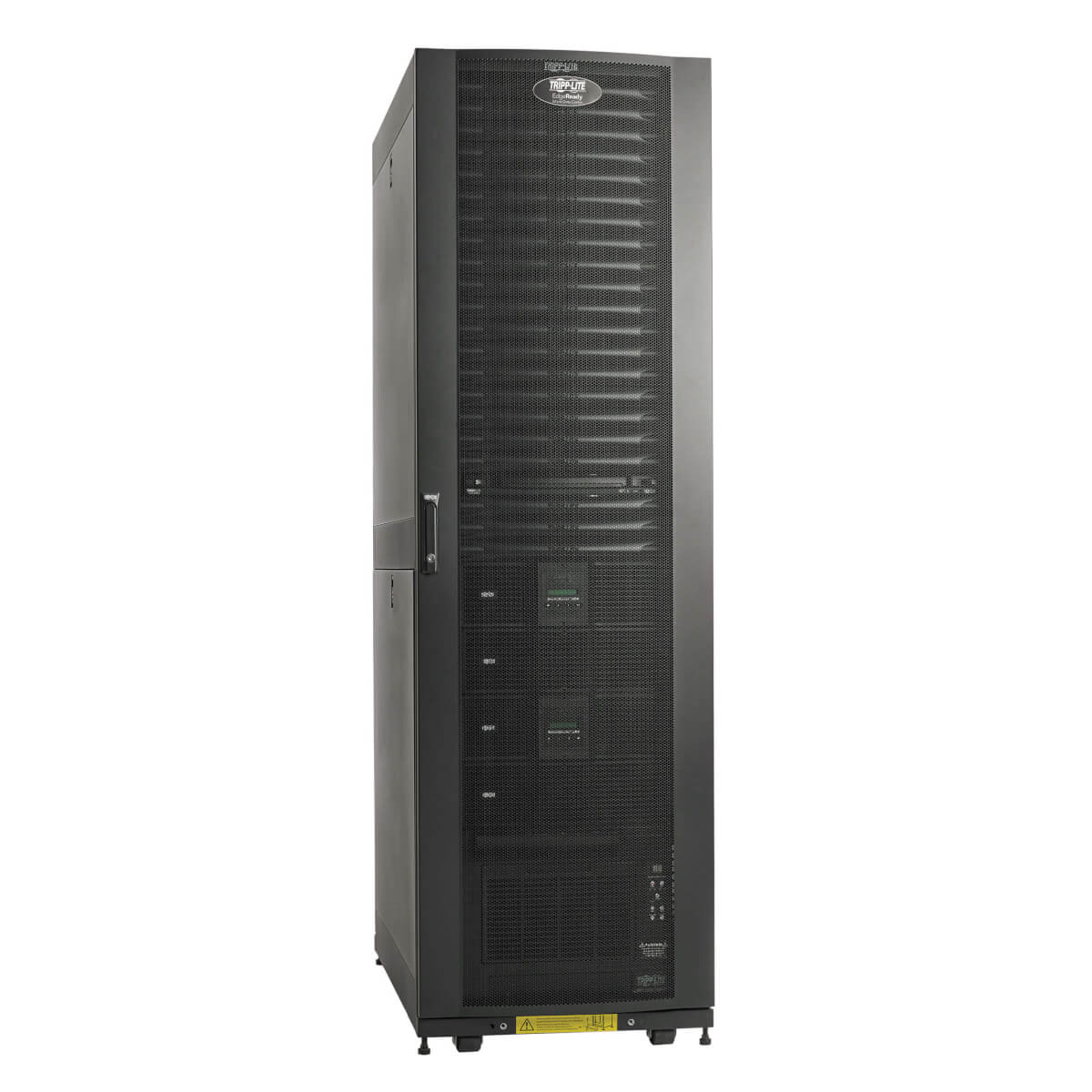 A SmartOnline® UPS system provides voltage- and frequency-independent (VFI) operation, expandable battery backup, zero transfer time and pure sine wave output. On-line double conversion isolates equipment from blackouts, brownouts, overvoltages, transients, surges, line noise, harmonic distortion, electrical impulses and frequency variations to prevent damage, downtime and data loss. Included battery capacity outlasts most power problems, and optional battery packs increase runtime. Two metered PDUs plug into the UPS system to provide numerous outlets and digital current metering. Optional switched PDUs add remote current monitoring, threshold notifications and outlet control.