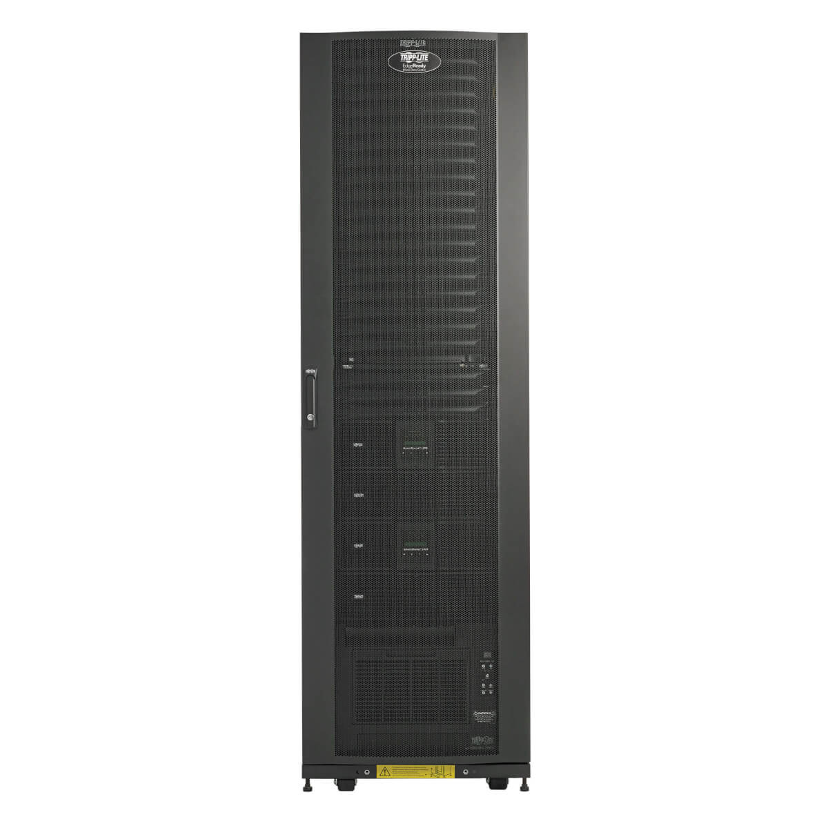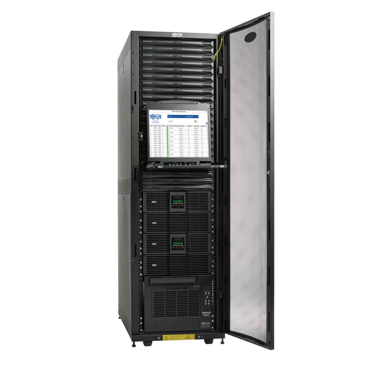 A SmartOnline® UPS system provides voltage- and frequency-independent (VFI) operation, expandable battery backup, zero transfer time and pure sine wave output. On-line double conversion isolates equipment from blackouts, brownouts, overvoltages, transients, surges, line noise, harmonic distortion, electrical impulses and frequency variations to prevent damage, downtime and data loss. Included battery capacity outlasts most power problems, and optional battery packs increase runtime. Two metered PDUs plug into the UPS system to provide numerous outlets and digital current metering. Optional switched PDUs add remote current monitoring, threshold notifications and outlet control.