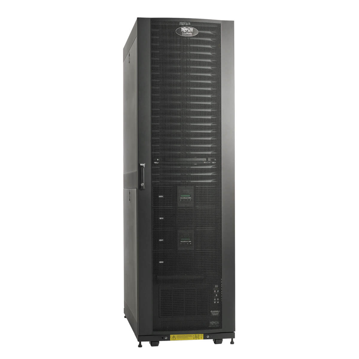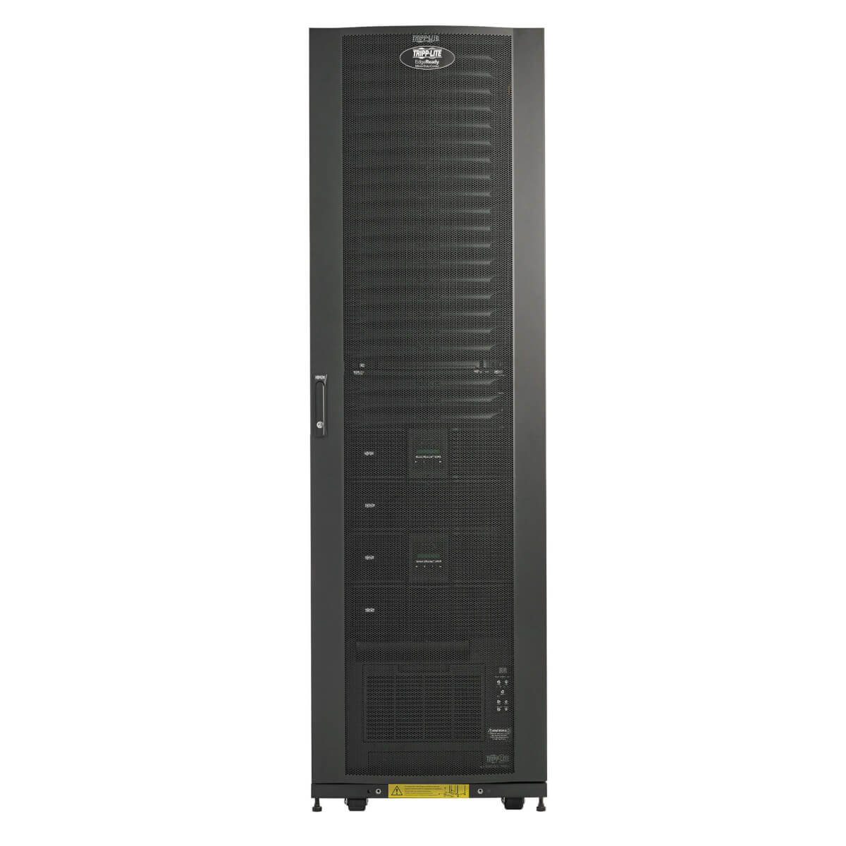 A PCI-compliant steel cabinet with EIA-standard mounting rails secures rack-mounted IT equipment. Doors and side panels lock to prevent unauthorized access, and an optional door-monitoring kit enables remote intrusion detection.