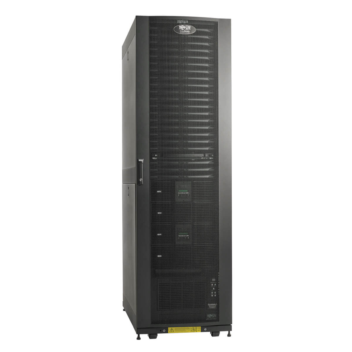 A SmartOnline® UPS system provides voltage- and frequency-independent (VFI) operation, expandable battery backup, zero transfer time and pure sine wave output. On-line double conversion isolates equipment from blackouts, brownouts, overvoltages, transients, surges, line noise, harmonic distortion, electrical impulses and frequency variations to prevent damage, downtime and data loss. Included battery capacity outlasts most power problems, and optional battery packs increase runtime. Two metered PDUs plug into the UPS system to provide numerous outlets and digital current metering. Optional switched PDUs add remote current monitoring, threshold notifications and outlet control.