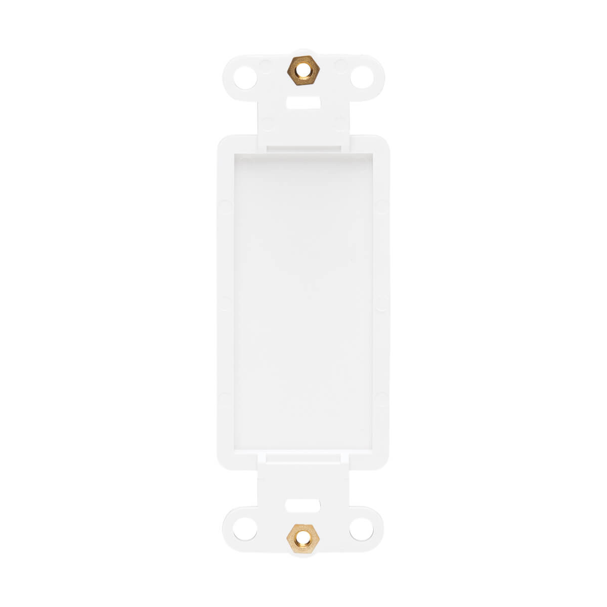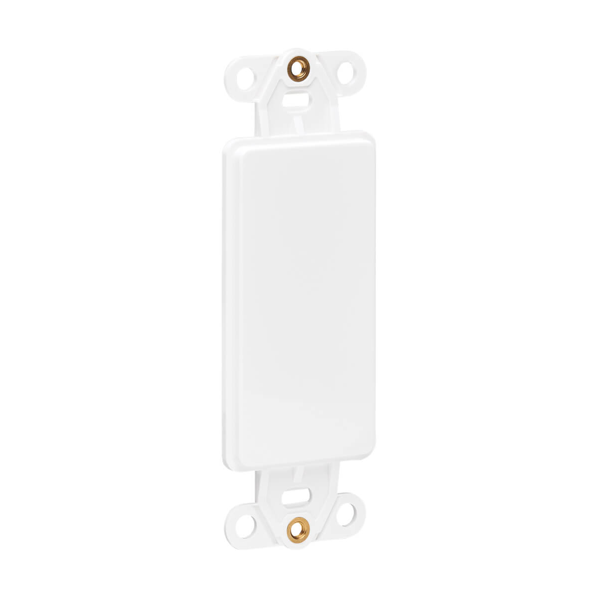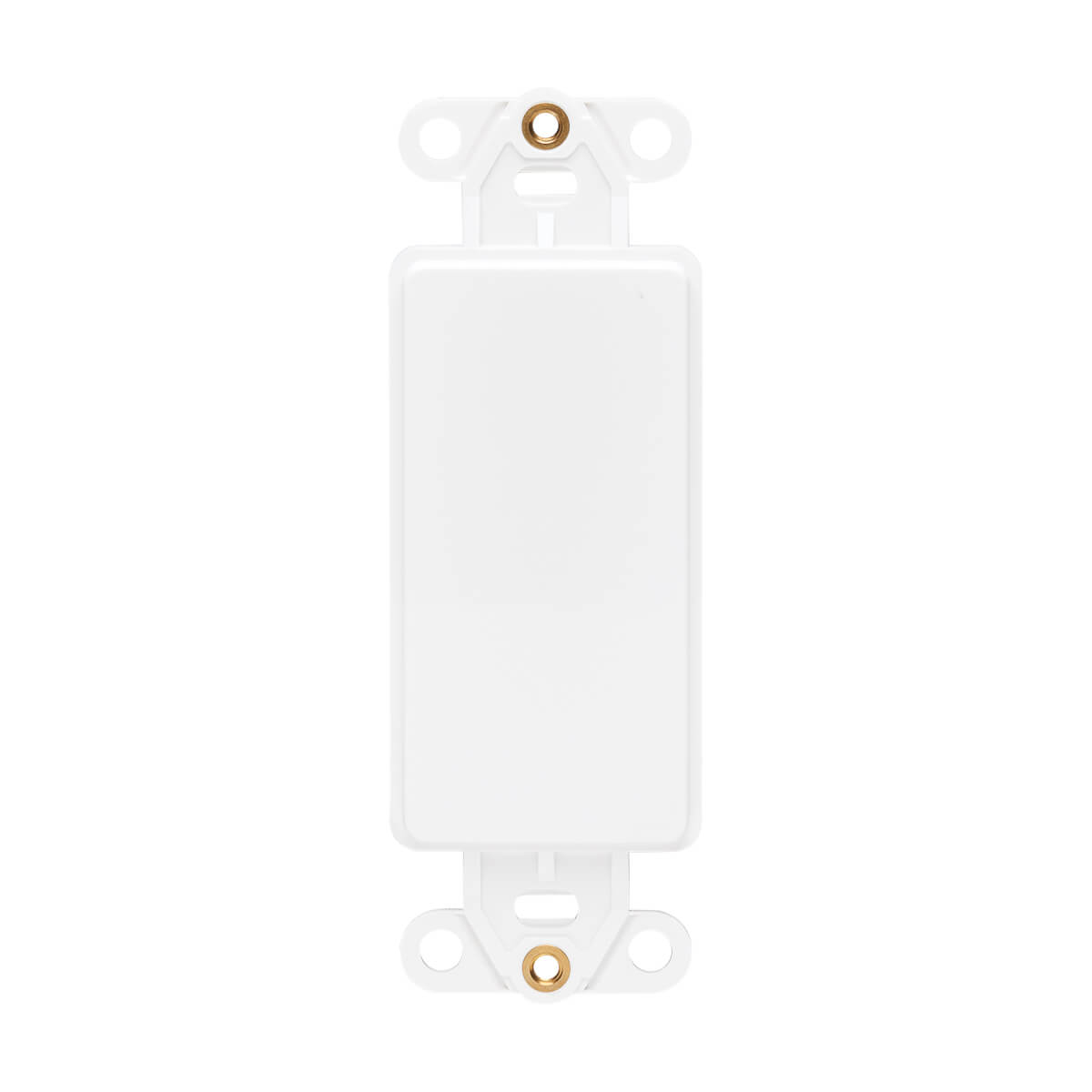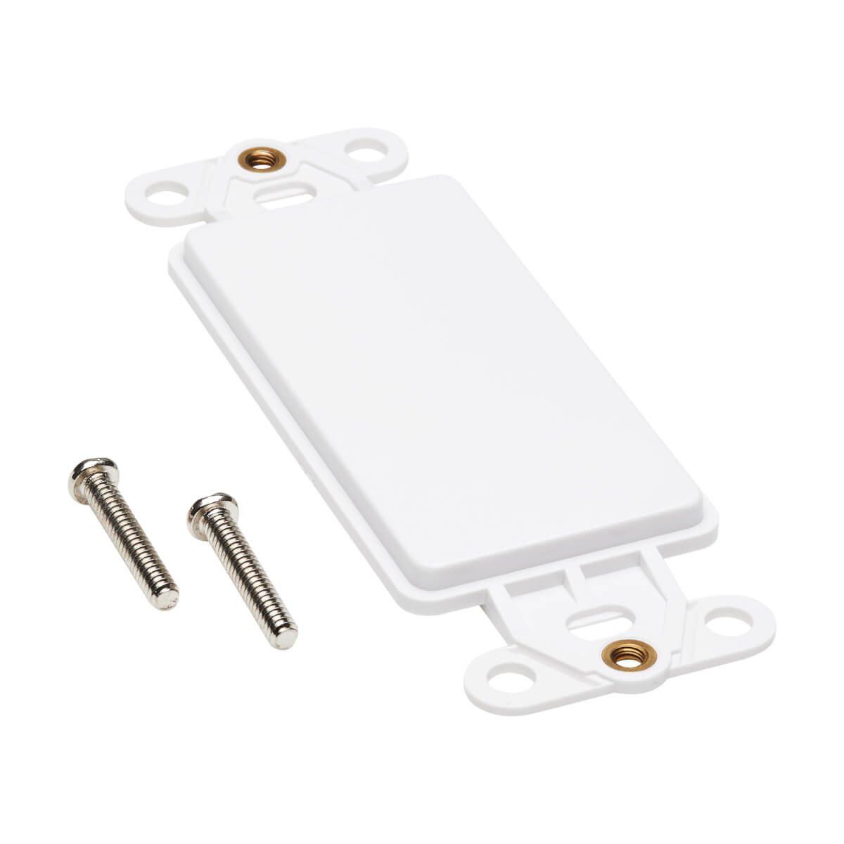 This blank center insert is ideal for temporary or permanent cover of any unused in-wall gang ports or outlets. It keeps the ports protected from debris or unauthorized cable connections until a permanent solution is desired. The Decora-style polycarbonate insert plate is white and blends elegantly into any home or office décor for a sleek, professional installation. Mounting screws are included for flush mounting the insert with a compatible Decora-style wall plate (sold separately).