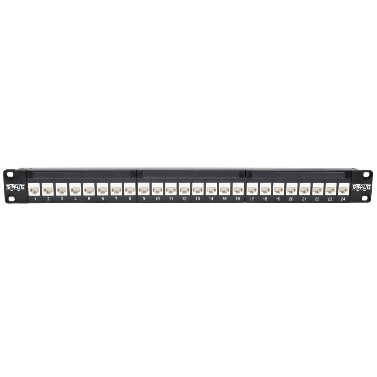 This patch panel meets or exceeds Cat6a specifications to enable quick, easy cable patching. Just plug Cat6a cables into its 24 front and rear RJ45 feed-through ports. No punch-down termination is required. Both the front and rear connectors are clearly numbered, and the front ports have blank labels to help you identify individual cable runs. The N254-024-6A supports EIA/TIA 568A and 568B wiring standards and is compatible with all network applications. It is fully rated for fast Ethernet data transfer speeds up to 10 Gbps.