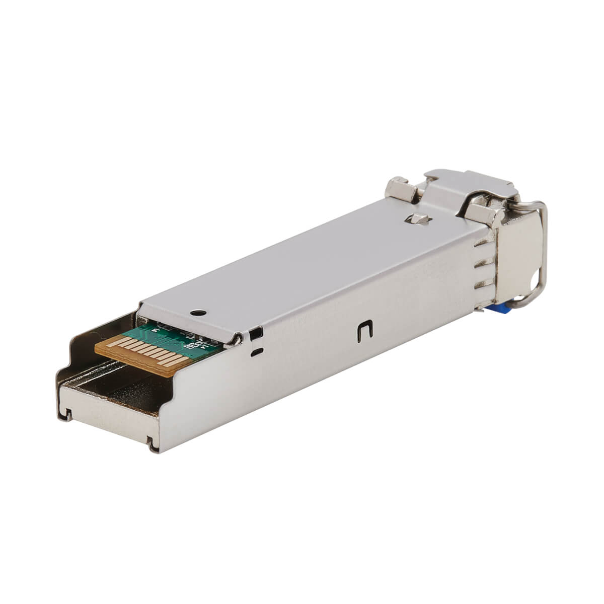 This SFP transceiver allows you to connect an 9/125 singlemode fiber optic cable to a 10/100/1000 Mbps network router, server or switch. It transmits data up to 10 kilometers (6.2 miles) and supports bi-directional Gigabit Ethernet communication up to 1.25 Gbps. The metal housing protects against electromagnetic interference (EMI) and excessive power dissipation.