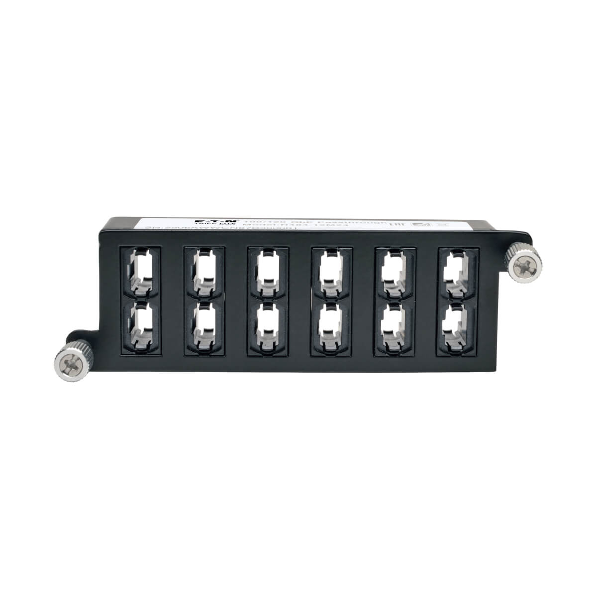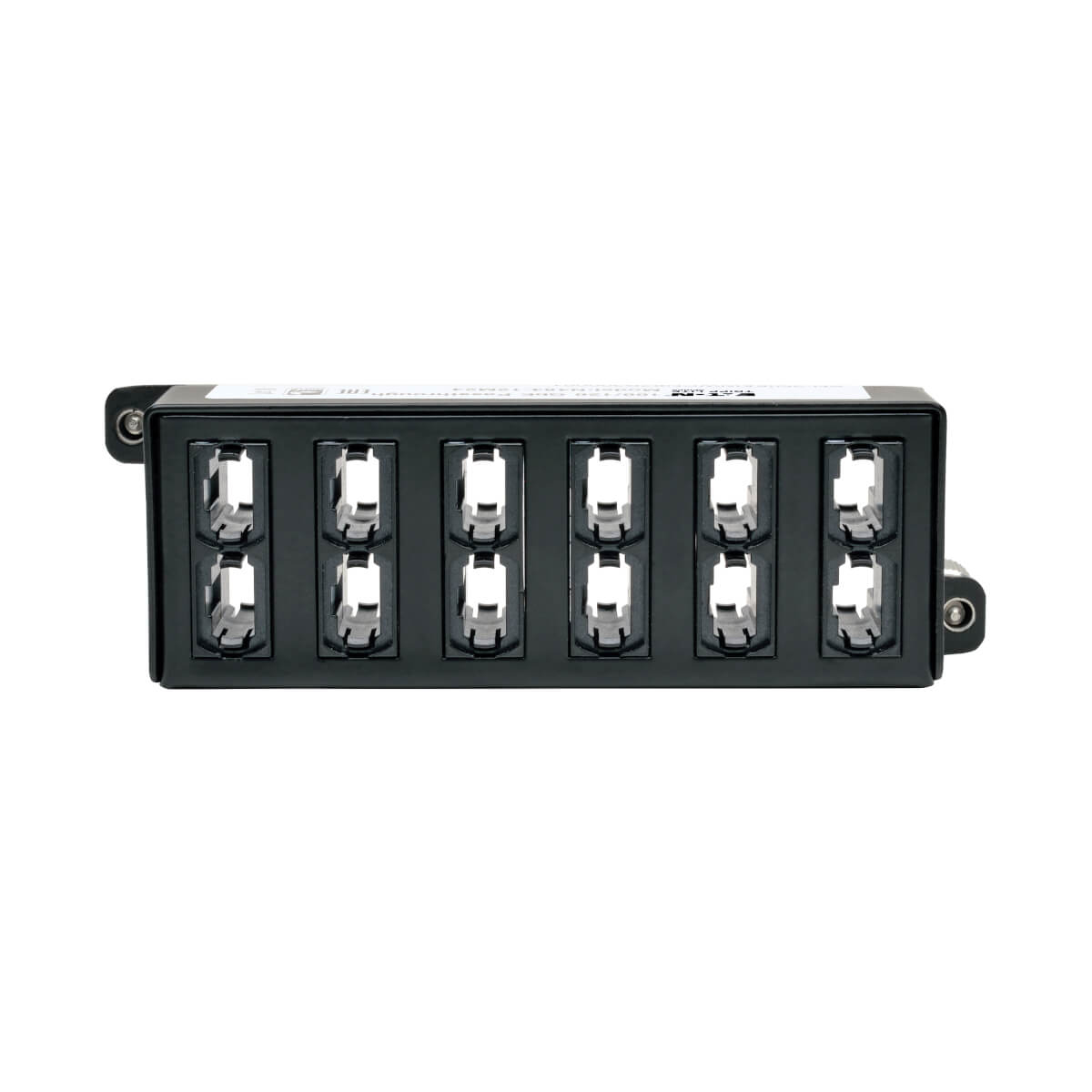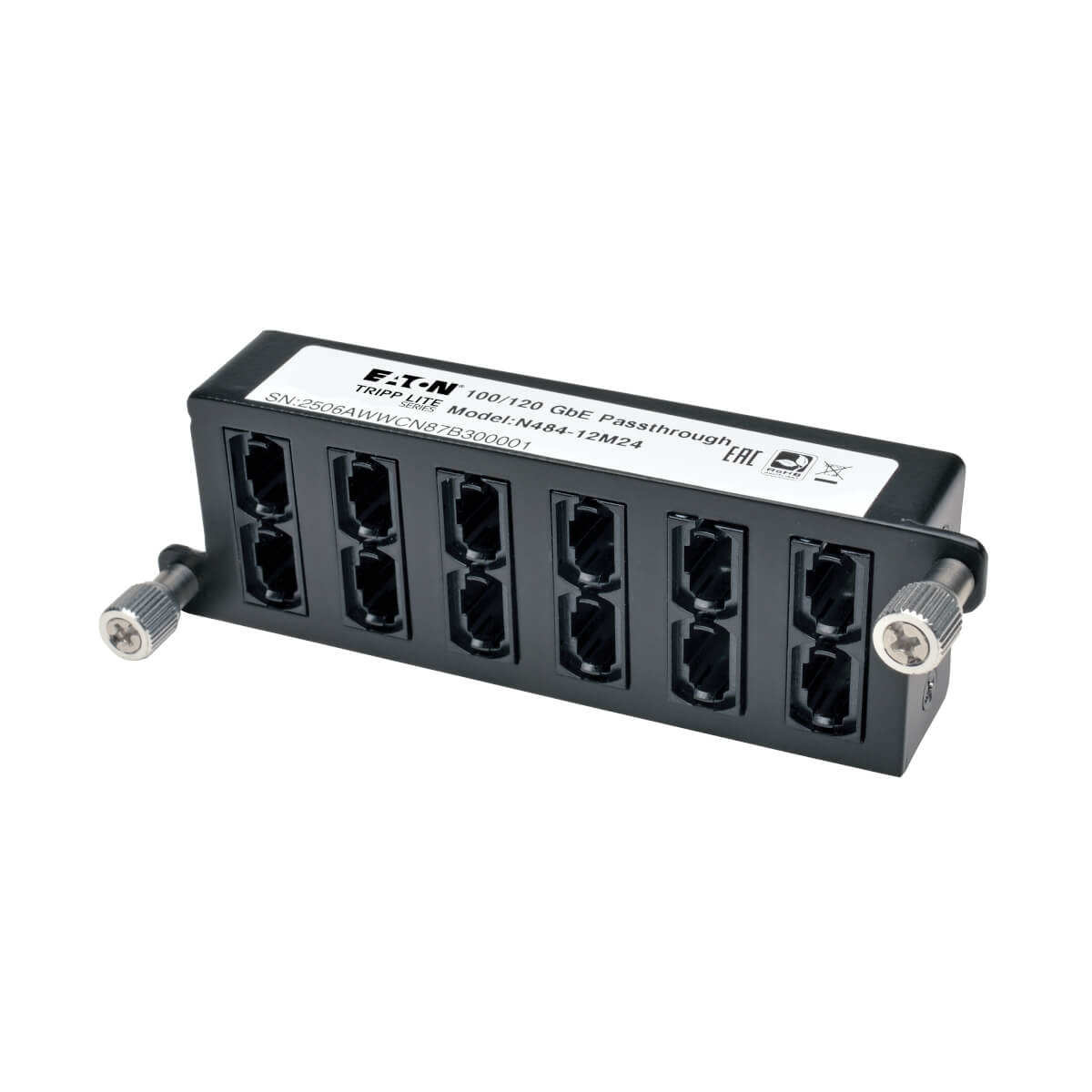 The N484-12M24 is a high-density 100/120 Gb Pass-Through Cassette with (x12) 24-Fiber MTP/MPO connections. Designed specifically for use with N484-00U and N484-01U chassis. Up to four cassettes per N484-01U or one cassette per N484-00U. Guaranteed compatibility when used with recommended cabling. Designed specifically for use with N846-Series cables. Installation is simple, with the cassette being easily installed or removed using screw tabs to lock or unlock it from the panel; no tools required. Furthermore, each cassette features factory-terminated connectors that reduce the time and labor required of field connector terminations. Cassette housing made with heavy-duty 1.0mm cold-rolled steel.