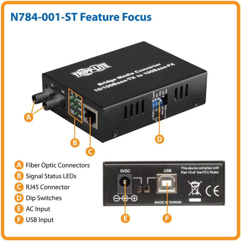 Tripp Lite's N784-001-ST, 10/100 Multimode Media Converter, is an economical way to extend the distance (up to 2Km) of network nodes by converting Cat5/6 UTP cables to Fiber Optic. The Media Converter features automatic MDI/MDI-X configuration, and the UTP port senses the network speed automatically as well. Dip switches allow half or full duplex operation on the fiber port. Power supplied by either AC-DC adapter, or USB connection (switch selectable). Tripp Lite