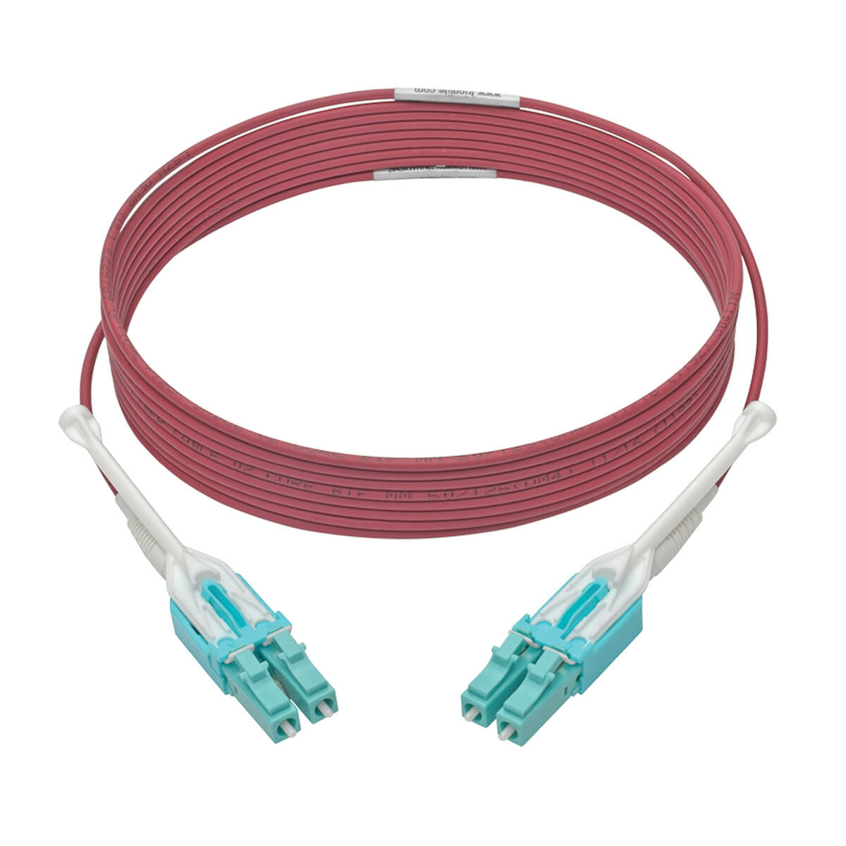 Colored magenta for immediate identification as an OM4 cable, the laser-optimized multimode fiber (LOMMF) N821-03M-MG-T is backward compatible with existing 50/125 fiber and commonly used with vertical-cavity surface-emitting laser (VCSEL) and LED laser light sources.