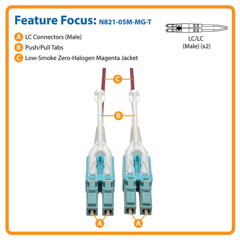 Push/pull tab connectors are easily accessible in high-density data center applications and make the cable easy to install and remove with one hand. Dual male LC connectors are widely compatible and thoroughly tested to meet stringent insertion loss standards. Premium-grade ceramic ferrules are designed specifically to handle applications of 10 Gb or higher.