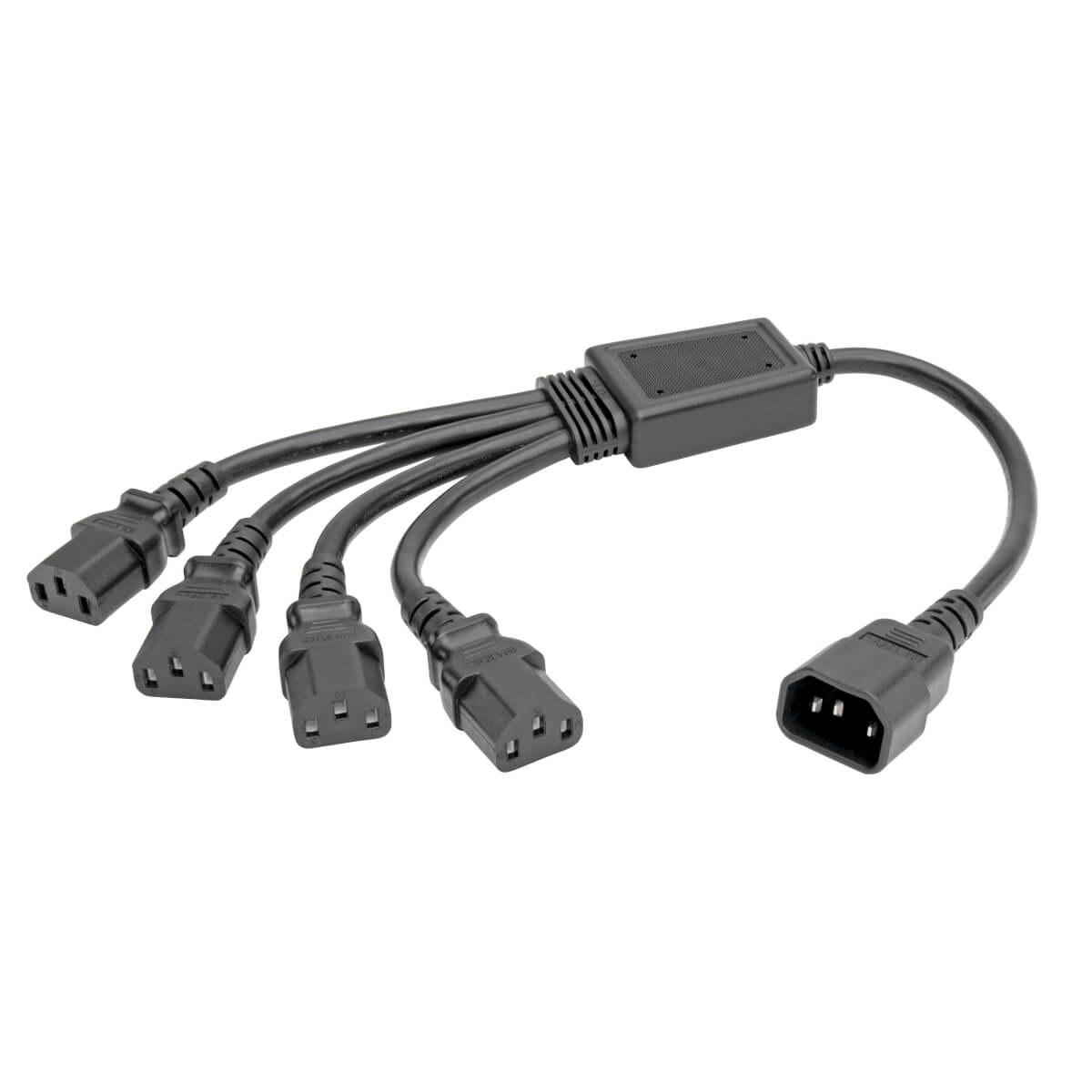 This IEC-320-C14 to IEC-320-C13 splitter allows four devices with C14 power inlets to share one AC input cord and one C13 outlet. This C14 male to C13 female cord features a C14 end for connecting to an AC power source on a PDU, surge protector or UPS system and four C13 ends for connecting to devices. By connecting four devices to one outlet, the power cord splitter frees up space in a PDU or surge protector and helps reduce cable clutter.
